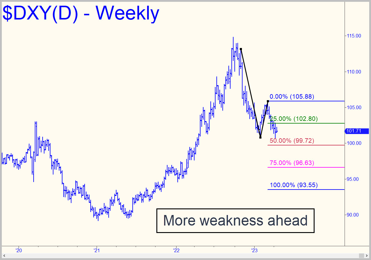 Using a longer-term chart has somewhat raised my minimum downside target to 99.72 from the 98.71 objective given here earlier. This midpoint Hidden Pivot support warrants close watching, since its failure, especially if decisive, could portend a move in the U.S. dollar from purgatory into the first circle of hell. A fall all the way to the 93.55 target would stoke inflation while giving gold and silver a strong boost. The A-B leg of the pattern is legitimately impulsive, and so we should expect it to give us an excellent read on the forces acting on the dollar.