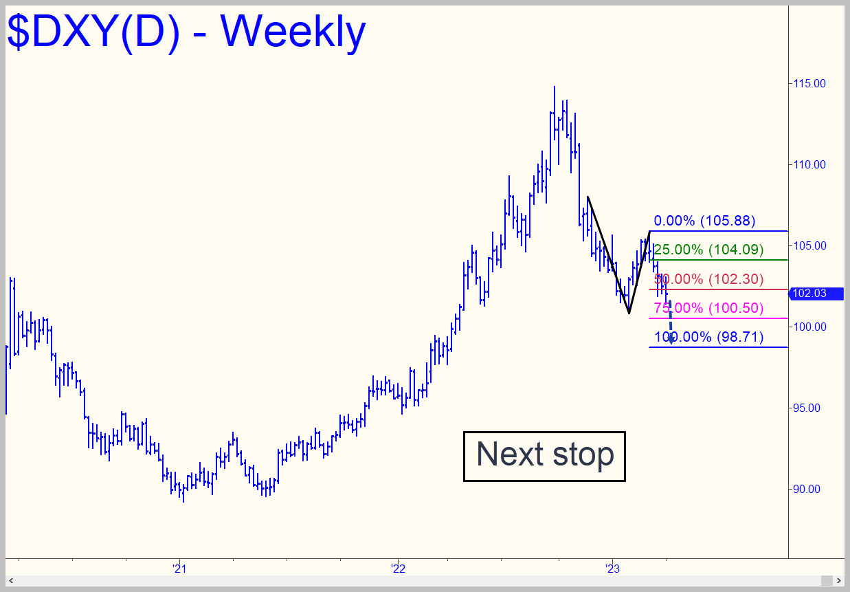 The Dollar Index dipped below the red line (p=102.30, a ‘hidden’ support’) for the third straight week, but this time it closed beneath it, implying more slippage over the next few weeks to at least D=98.71. Although this will lighten selling that has weighed on bullion, it will also increase the intensity of the world’s nascent revolt against the dollar. The insurrection can only go so far, however, since the huge, largely unpayable debts that have piled up around the world are in dollars, effectively creating a massive short position against the greenback. This will ultimately come home to roost in the only way it can, via a deflation that liquidates all debts through bankruptcy. Economists and pundits seem to think the Fed will pull a ‘Weimar’ and hyperinflate the debt away, but there are a hundred good reasons why this scenario is an extreme outlier. I’ve written extensively on the topic over the last 30 years, but read Adam Fergusson’s When Money Dies if you want to understand why boxcars filled with dollars will not be a feature of America’s coming economic collapse.