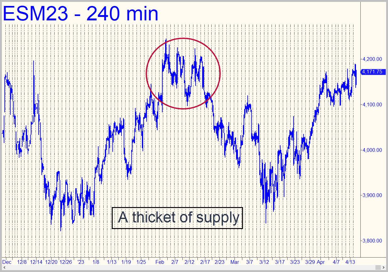 A chart stretching back to November provides no compelling technical basis for saying anything interesting, let alone bullish or bearish, about what might happen next. It’s anyone’s guess, although the June contract would have to eat through thick layers of supply to achieve new recovery highs above February’s 4244 peak. Poor earnings would help, since the mere expectation of them is usually enough to get stocks sold out before the news hits. With or without grim tidings to drive the rally, we can be assured that intraday highs and lows will continue to be predictable enough to give us an edge. Friday’s peak, for instance, missed a ‘D’ Hidden Pivot target that was as obvious as the punchline of a mile-long stretch of Burma Shave signs. _______ UPDATE (Apr 20, 11:12 p.m.): There are some days when we should just avert our eyes and this was one of them. A sinking VIX belies the nuttiness animating stocks these days. We should start loading up on puts today and Monday, because I strongly doubt that these histrionics are torquing the market for an ebullient move higher. That seems doubly true with The Wall Street Journal’s bullish spin on…everything starting to sound increasingly desperate. DaBoyz are getting ready to pull the plug.