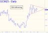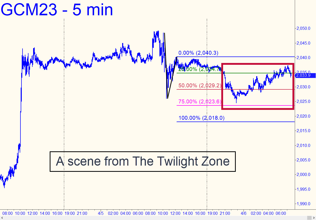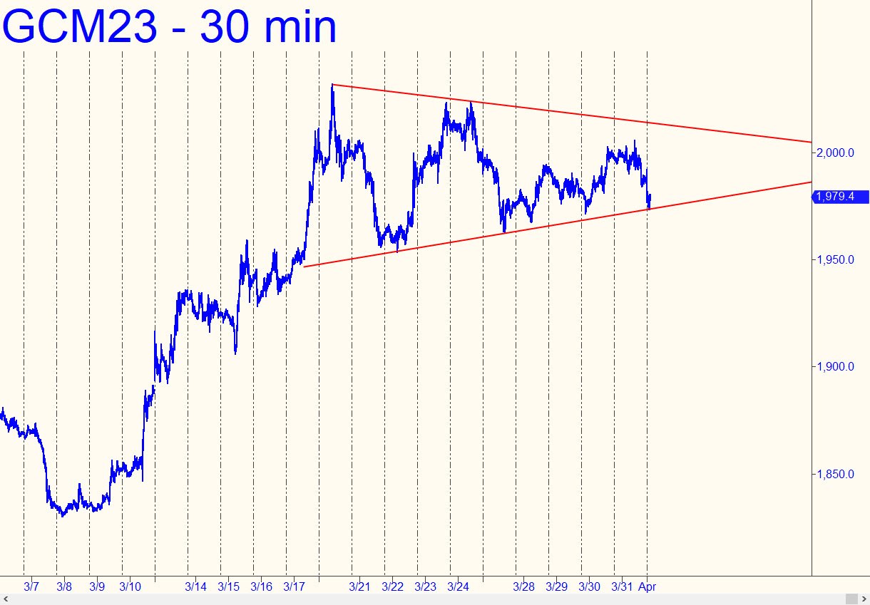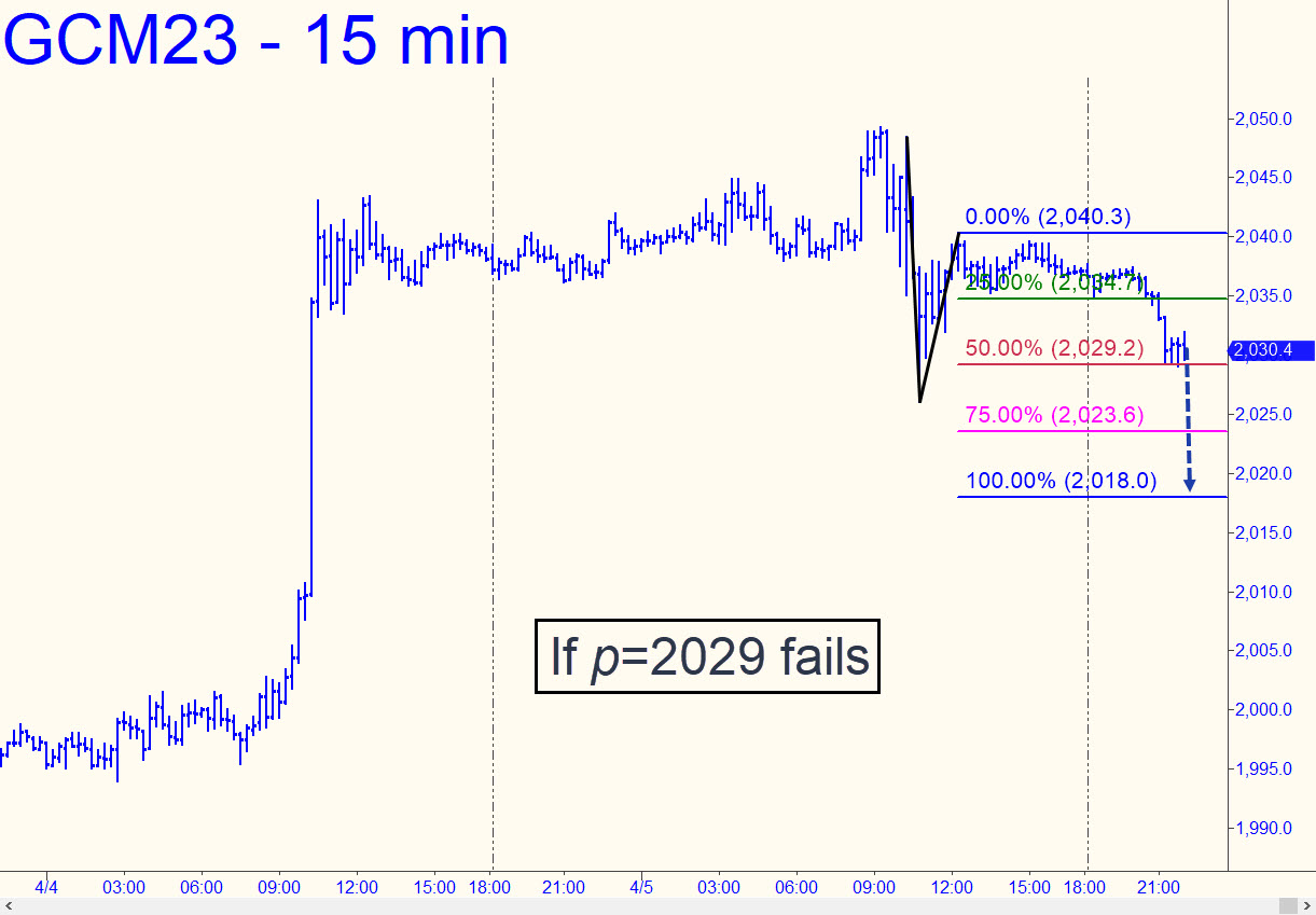 Bulls and bears both held their cards close to their chests last week. The latter cannot bluff effectively or for long, however, since bullion is in a bull market. However, the question on everyone’s minds is whether gold is overdue for a punitive correction of the $350 run-up since November. Price action relative to the pennant formation shown in the chart (inset) should tell us soon whether a bearish outcome is likely, but there is nothing that I can discern in the chart that argues for betting the ranch on a particular scenario. For now, brace for savage, meaningless feints. most of them lower, since the quasi-criminals responsible for gold’s gratuitous swoons have sufficient control over the futures to peg their price nearly anywhere over the short term. ______ UPDATE (Apr 3, 5:37 p.m. EDT): The ass-bandits took out the lower trendline on very light volume to begin the day, then bought aggressively to drive the futures nearly to the upper trendline by midday. I’ve altered the pennant somewhat to keep the futures within bounds, but don’t expect the thieves to pull the same stunt if the break-out is to the upside, since they won’t be able to trick buyers as easily as they suckered sellers. Here’s the new chart. _______ UPDATE (Apr 4, 12:13 p.m.): Gold’s impaling spike through p=2016 this morning implies more upside over the near term to at least 2079.40. Here’s the chart — and yes, the pattern should work well for ‘mechanical’ buying on swoons. _______ UPDATE (Apr 5, 10:01 p.m.): The futures will be headed down to exactly 2018.00 straightaway if support at the 2029 midpoint Hidden Pivot fails. _______ UPDATE (Apr 6, 7:45 a.m.): Well, I guess we’ll just have to see about that. June Gold cracked $2029 overnight, then reversed as it nearly always does at a time of night when few in the English-speaking world are watching. What happened next was a bizarre, ratcheting rally that looked like something out of an abnormal-psych textbook. It reached the green line at 5:55 in the friggin’ morning, tripping what I would warrant as a succulent ‘mechanical’ short predicated on a still-indicated drop to D=$2018. We shall see. Here’s the graph, which would be Exhibit A if the slimeballs, clowns and government helpers who manipulate bullion in obscene ways were ever put on trial.