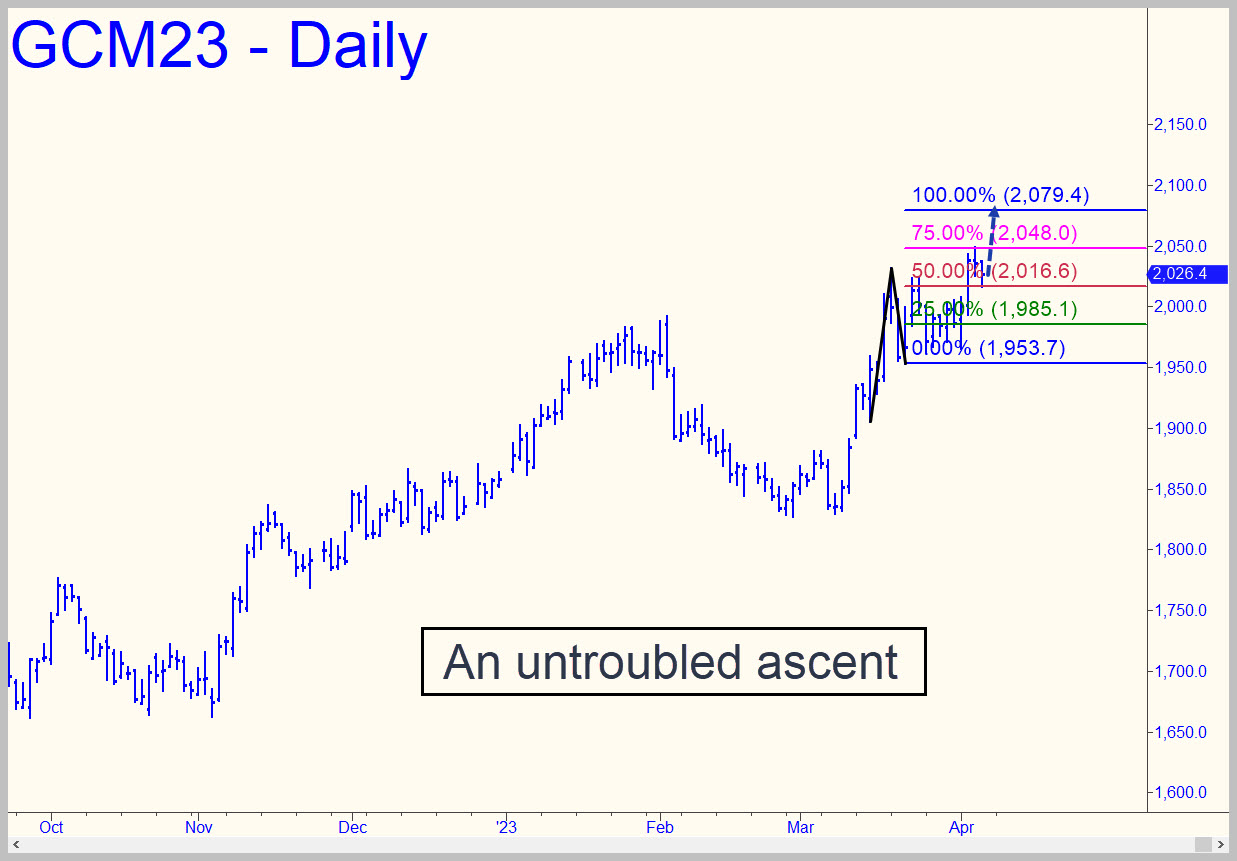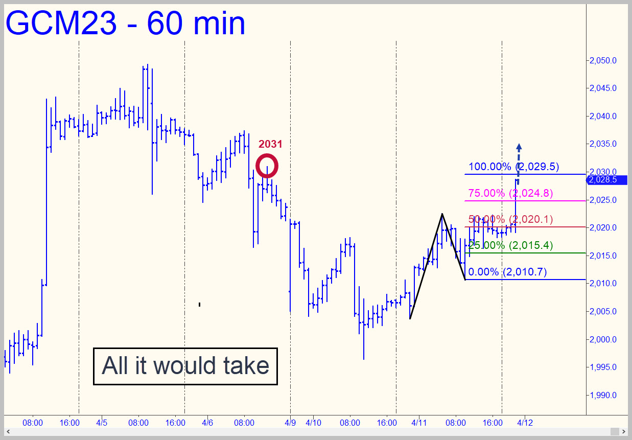 We’ve been using the 2079.40 target shown as a minimum upside objective, but there’s a yellow flag out at the moment because Friday’s high at 2049.20 precisely coincided with Hidden Pivot resistance levels associated with two bullish patterns, including the one targeted on 2079.40. The pattern has already enabled a ‘mechanical’ buy at the green line that could have been worth as much as $6400 per contract. A second such signal would occur on a pullback to 1985.10, stop 1953.60, but I’ll suggest tuning to the chat room if the opportunity gets close, since theoretical entry risk exceeds $3000 per contract. ______ UPDATE (Apr 11, 9:52 p.m. EDT): The futures look all but certain to achieve the 2029.50 target of this pattern, but the picture would brighten still move if this thrust can take out the 2031 peak to the left without pausing for breath. _______ UPDATE (Apr 12, 5:49 p.m.): The rally accomplished what we’d asked of it, then gold did its by-now-obligatory Daily Dive. A score more of them will not change the fact that this is a bull market and that all upside targets provided here for the foreseeable future will be achieved more or less exactly, if sometimes tortuously.