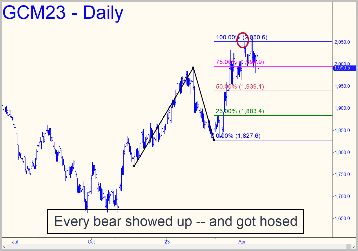 Gold has been leaden for a month, presumably to set up a nasty surprise. But for whom — bulls, or bears? My hunch is the latter, but we’ll keep an open mind just in case. They evidently were fixated on the 2050.60 target shown in the chart and may have been patting themselves on the back when the futures whipped around and shot up to a marginal new high that stopped every last one of them out. We shouldn’t underestimate the lingering pain, nor their natural desire to even the score. Look for wicked swings to precede a drop to at least p=1939.10 if there’s going to be a consolidation for another big leg up.