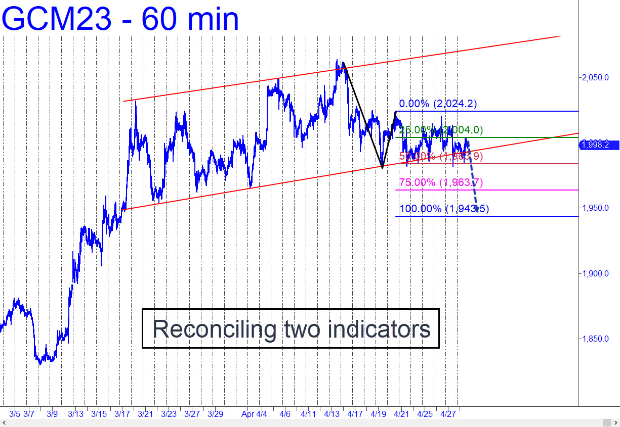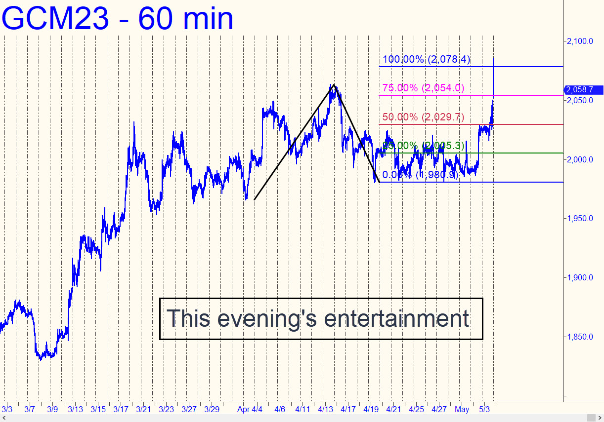 I seldom display charts that contain two technical indicators, but in this case I wanted you to see the whole picture, which projects a likely drop to D=1943.50. The June contract has been pounding on the lower support of a channel for two weeks, but when it finally gives way, expect it to head down to D, a middling Hidden Pivot support. The pattern is gnarly enough that it should allow for bottom-fishing with a tight stop-loss (or preferably a minor ‘reverse pattern’ trigger). Please note that the futures have been on a ‘mechanical’ sell signal since rallying to the green line a week ago. ______ UPDATE (May 2, 6:20): Gold continued its wacky, daily swings with an explosive rally that exceeded the point ‘C’ high of the bearish pattern targeted on 1943.50 (see above.) Now. if buyers impale p=2029.70, look for more upside to D=2078.40 over the near term. ______ UPDATE (May 3, 6:18 p.m.): The futures got even wackier after the close, spiking nearly $50 to a so-far top at 2085 that lay 0.3% above my 2078.40 target. A wrenching $30 swoon [Update 5/4 at 8:36 a.m.: The swoon is currently $47] has followed, but hysterical buyers are probably still out there in droves. If they lift the lid anew, the futures could be bound for a more durable peak at 2183.30. A vicious pullback in the meantime to 2020.00 would trigger a ‘mechanical’ buy, stop 19https://bit.ly/3ND4uvY80.00 (A=1906 on 3-15). Here’s a fresh chart.