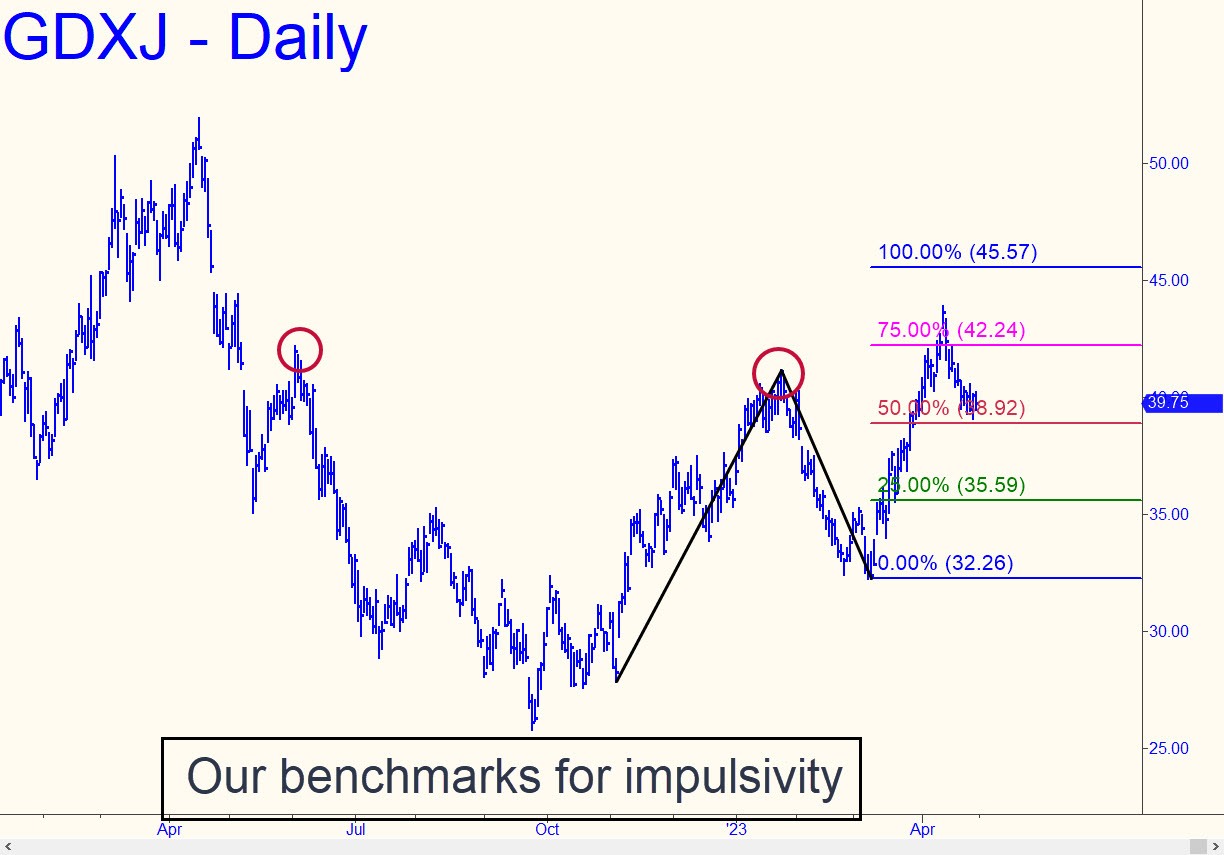 We can be confident the so-far 11% pullback from the April 13 top at 43.89 is merely corrective rather than the start of a sickening decline, since GDXJ surpassed two important peaks — one internal, the other external (circled in the chat) — before taking a breather. This generated a quite powerful impulse leg, one with the potential to push this gold-miner proxy into the low-to-mid-50s. A reverse pattern that starts with January’s 41.16 peak suggests GDXJ will become an opportune buy at either 37.40 or, worst/best-case, 35.24.
