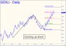 GDXJ turned south well shy of the 45.57 rally target we’ve been using for the last few weeks. If Comex Gold and Silver futures had not made what appear to be intermediate-term tops at the same time, I’d be more confident about GDXJ fulfilling its price objective. Its rally has been even steeper than gold’s, but perhaps that means it will lead the way higher once this correction in bullion has run its course. A drop to the red line would signal a ‘mechanical’ buying opportunity, but a death dive to x=35.39, however scary, would be even more enticing as a place to reload.