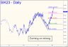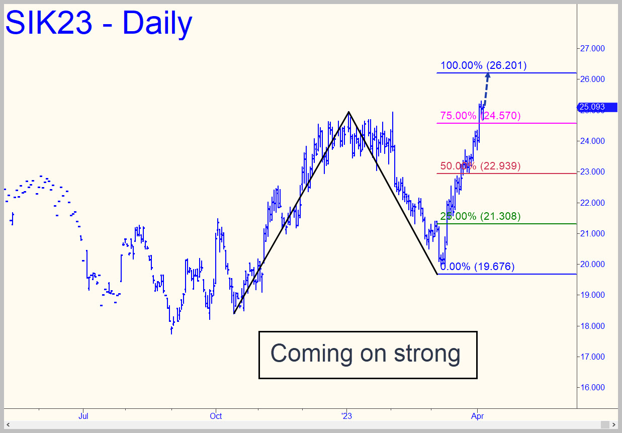 Buyers easily handled ‘hidden’ resistance last week at p2=24.57, implying the futures remain on track for a run-up to at least 26.20. [Changed to correct a rickism that gave the target initially as 26.01.] This target is slightly lower than the one previously given, since it’s derived from a one-off ‘A’ different from the original. That was a ‘Pontiac/Oldsmobile’ middle-of-the-roader that I’ve usually advised shunning, since it often misses final highs and lows. The rally has been too steep to enable ‘mechanical’ entries, but a drop to the red line would signal one nonetheless, stop 21.85. _______ UPDATE (Apr 13, 6:09 p.m.): Buyers pushed the May futures to within 0.3% of the 26.20 target, effectively fulfilling it. A pullback is likely but not certain. The next important resistance is an external peak at 27.22 from March 8, 2022, and its breach would refresh the bullish energy of the long-term charts.