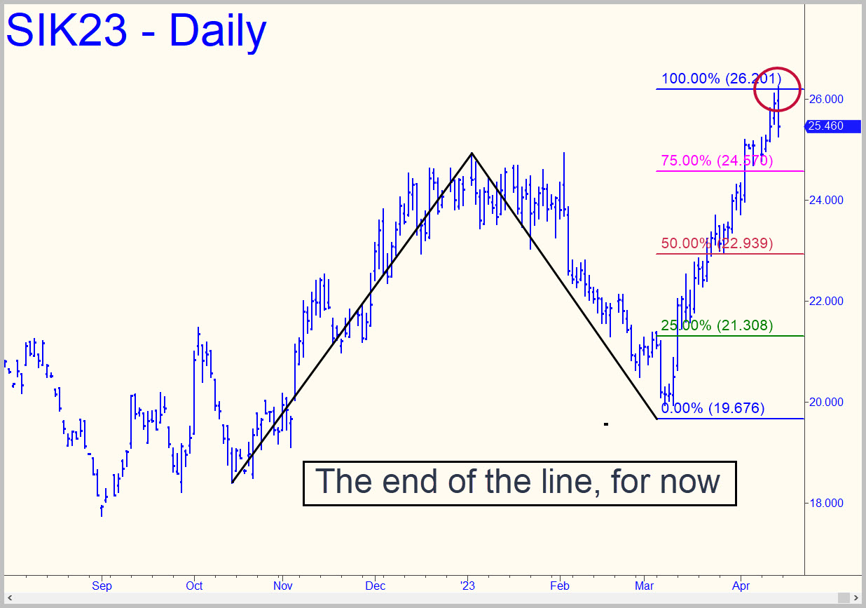May Silver on Friday precisely fulfilled a Hidden Pivot target at 26.20 that was six months in coming. The actual high was 26.23, but don’t expect much more than that for the time being, since buyers could use a rest. Two or three weeks could enable them to recover, but in the meantime we’ll trade this contract with a bearish bias. We should also pay close attention to corrective ABC patterns, since an overshoot of their d targets would signal more downside while sharpening our assessment of trend strength.