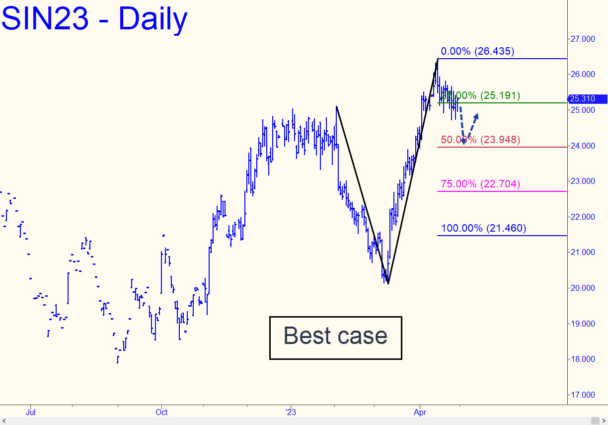 July Silver has been in a so-far moderate correction of a top two weeks ago at 26.43 that we had precisely anticipated for the May contract. The corrective reverse pattern that I’ve drawn is probably more bearish than what we’ll see, but it should still work for purposes of trading, forecasting and gauging trend strength. For now, you can use p=23.94 as a minimum downside objective. That Hidden Pivot support can be bottom-fished provided you are capable of limiting the risk tightly. A decisive penetration of p would shorten the odds of more weakness to D=21.46. _______ UPDATE (May 1, 10:03 a.m.): Scoundrels, lunatics and short-covering bears inadvertently teamed up before dawn to goose silver into a spasm that has turned the short-term picture bullish. The rally would become still moreso if and when it exceeds the 26.43 peak recorded on April 14. That would bring a 26.91 target into focus (60-min, A=24.26 on April 4). _______ UPDATE (May 2, 7:38 a.m.): The futures just bounced from a voodoo number without having taken out the 24.735 ‘C’ low of the bullish pattern shown in the current chart. They will need to hit 25.12, however, to suggest the rally has sticking power, and 25.36 to get out of trouble. _______ UPDATE (May 2, 6:30 p.m.): The futures easily exceeded my benchmarks (see above), setting up a possible run at the 26.43 peak recorded on April 14.