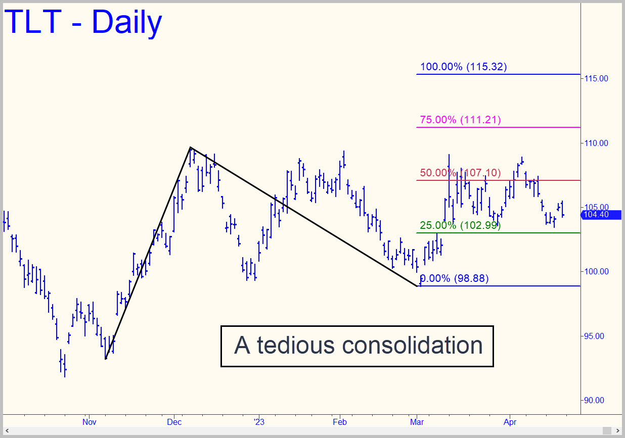Bond bulls could have locked up the 115.32 rally target shown in the chart with a small upthrust a couple of weeks ago, but they chickened out. The opportunity to generate a powerful impulse leg with a small move exceeding three closely-spaced peaks will have to wait for another day. Even so, the chart still says ‘bullish consolidation’ clearly. It is mildly bullish that three feints lower have failed to gift us with a ‘mechanical’ buy at the green line. When it finally happens, be prepared for the low to occur beneath x=102.99. _______ UPDATE (May 1, 4:07 p.m. EDT): TLT’s crash today looks like it still has a little ways to go. Bottom-fishing at D=101.90 with a very tight stop-loss looms as a decent bet. You can substitute call options if you prefer. _______ UPDATE (May 2, 10:45 p.m.): The low occurred below 102.99, all right– 15 cents below it. That was just before TLT reversed and took off like the bat out of hell depicted in the eponymous Disney animation. Mention having caught the low in the chat room and your name will be entered in drawing for a coat made from genuine snow leopard pelts.
