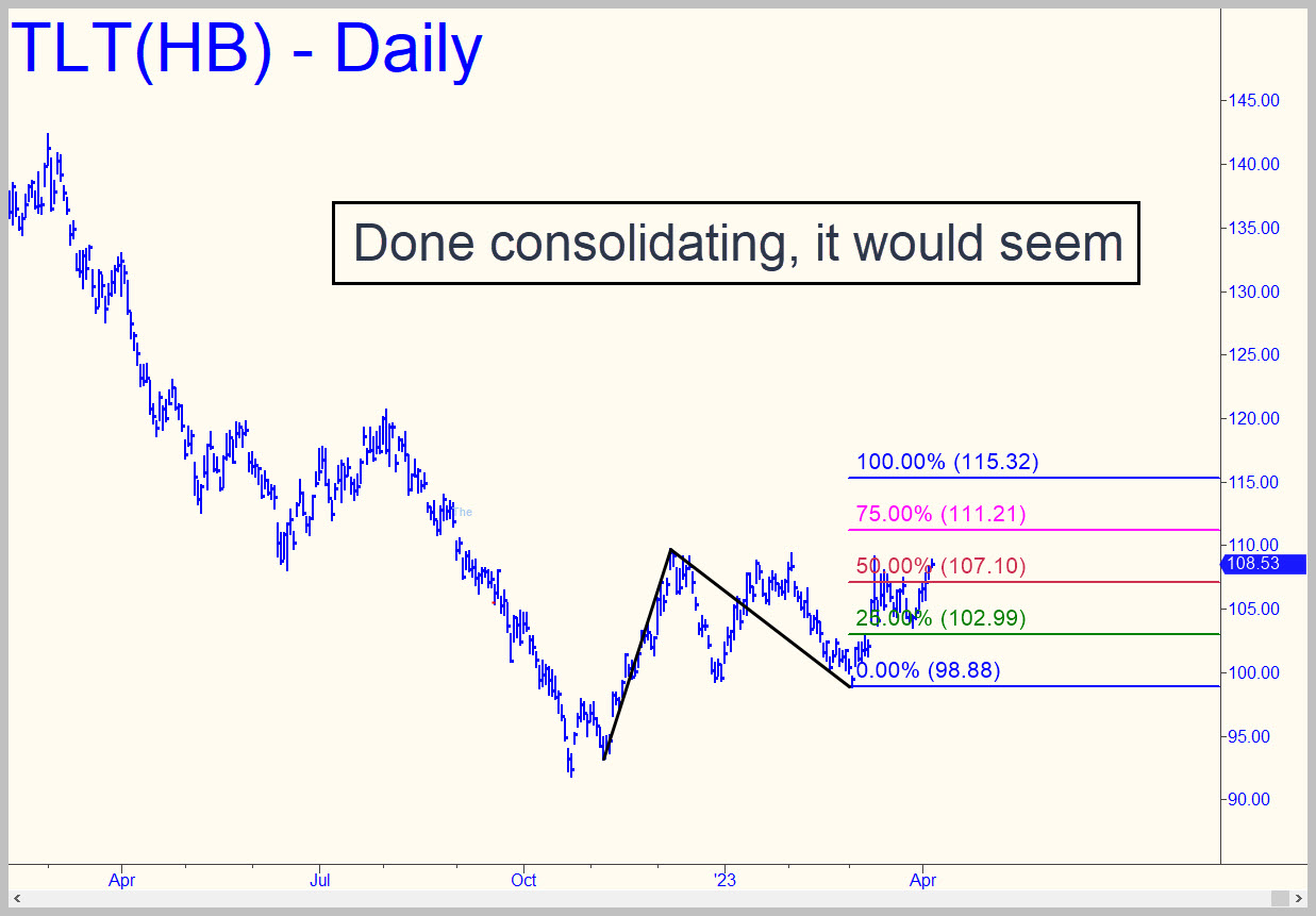 Three weeks’ worth of gratuitous feints, thrusts and dives have yet to deliver a ‘mechanical’ buying opportunity at the green line, hinting that this vehicle will be on its way to D=115.32 once the dithering ends. It would take just a small push to ensure this, since there are three closely spaced peaks ranging up to December 7’s 109.68 that could conceivably be exceeded with a rally of just a little more than one point. This prospect complicates the logic of those who think the dollar is in trouble, since it is not mainly dollars that our many detractors around the globe hold as IOUs, but Treasury paper whose appreciation has alleviated the pain of weak U.S. currency.