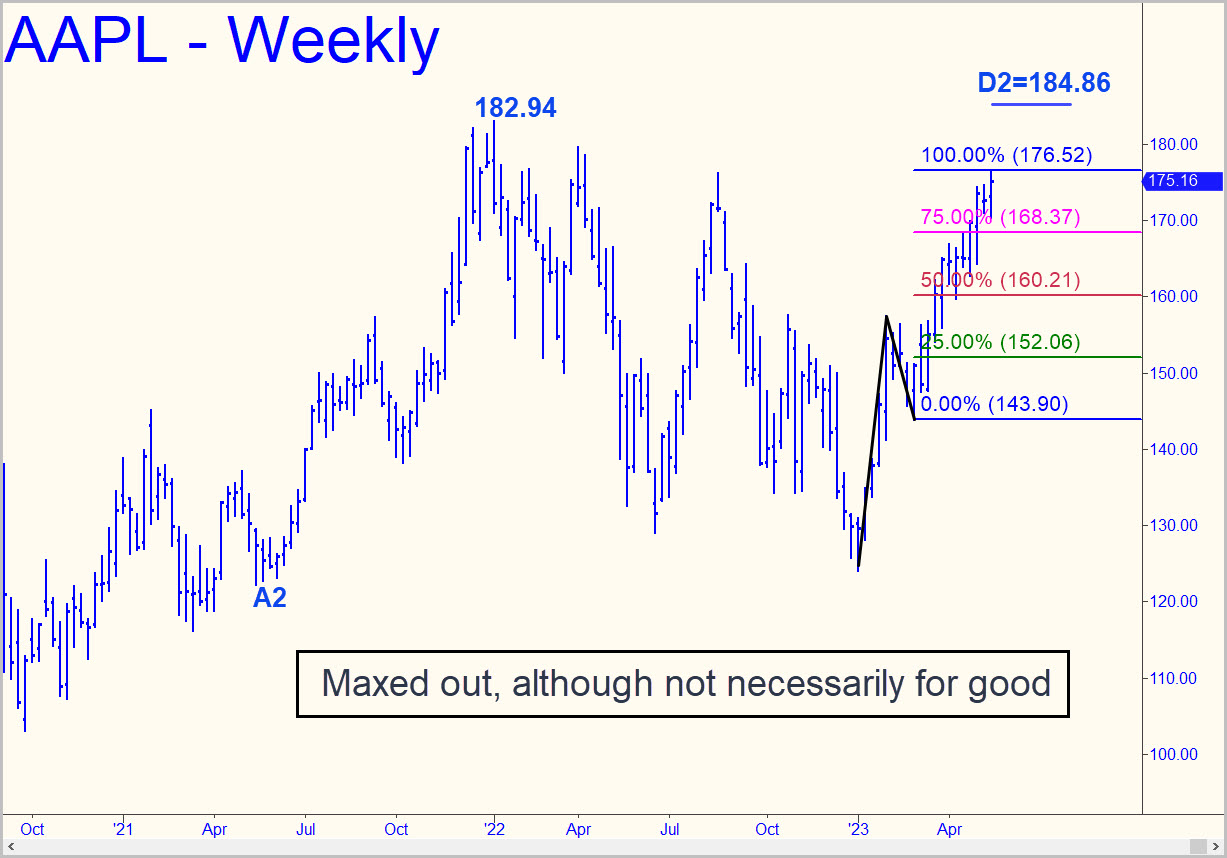 Last week’s waft maxed out the pattern shown, nearly touching a potentially important D target at 176.52. The actual high at 176.39 fell just 13 cents shy. We bought some 2 June 165 puts at or very near the low of the day just in case, but don’t get your hopes too high. Because the pattern has taken more than four months to play out, we might expect a pullback of at least a few weeks’ duration to give buyers a rest. However, they will be tempted in any event to push past the resistance in order to to take on three formidable ‘external’ peaks recorded, respectively, at 176.15, 179.81, and 182.94, the all-time high notched in January 2022. Anything above that would still beckon caution, since there is a Hidden Pivot resistance to overcome at 184.96 with some stopping power. What a head-fake that would be! The stock will be easily shortable if it moves into the midst of the prior peaks listed above. Since subscribers seem not to trade the stock, you’ll need to nudge me in the chat room for timely guidance. Meanwhile, offer half of the puts to close for twice what you paid for them. ______ |UPDATE (May 23, 6:28 p.m.): The puts doubled to 0.57 today as the stock’s downtrend lengthened, so you should have cashed out half of the position to leave you with no skin in the game. There was a raucous cavalcade of buyers in the chat room on Friday when the 0.28 bid I’d advised caught the lowest price ever paid for the 2 June 165 puts. Today, however, only one subscriber seemed to have noticed that the puts were on the move. I suggested keeping 25% of the position for a bigger win than you might currently imagine is possible.
