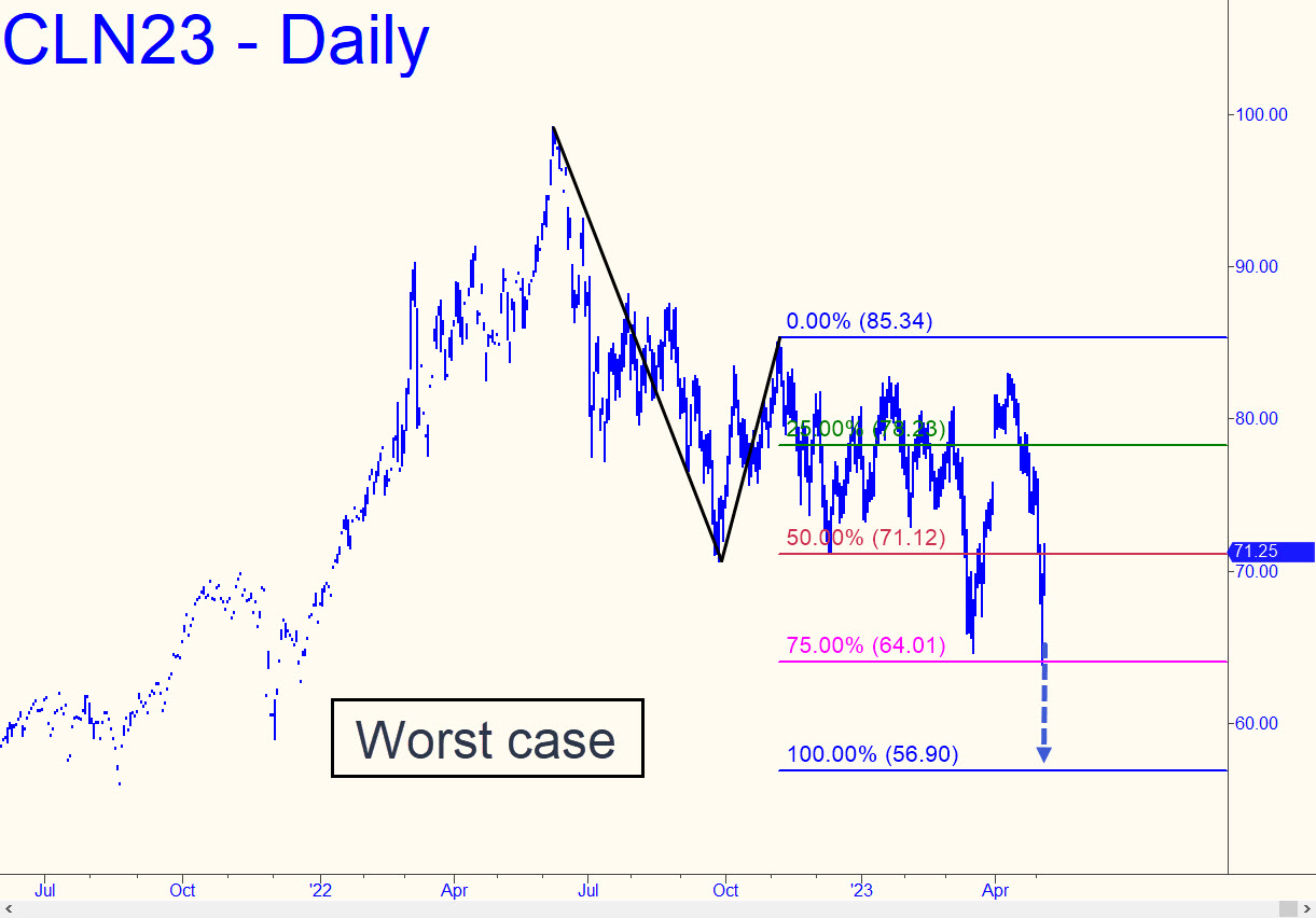 The chart shown, with a downside target at 56.90, is one of the few I’ve presented here that actually might not be good enough for government work. The A-B impulse leg is one that only a mother could love, since its ‘B’ bottom surpassed no distinctive prior low. On the other hand, no fewer than three kamikaze dives have reversed almost precisely from p and p2 Hidden Pivots. Regardless, the theme I have sounded here for nearly a month — that the Saudi cutbacks amounted to a toothless threat — has helped keep us on the right side of a downtrend that evidently knows a global recession when it sees one.