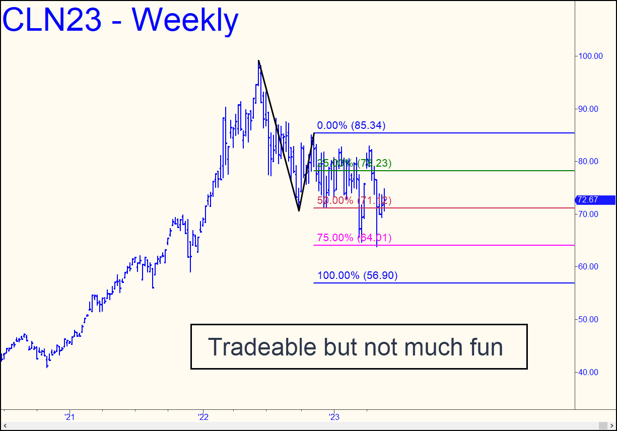 I’ve struggled to feign interest in crude, since it is hostage to geopolitical forces that taken together do not add up to anything whose meaning could be distilled for predictive purposes. There is scant interest in the chat room in trading this vehicle, although sometimes a subscriber will mention having used an ETF to leverage my targets. There’s one at 56.90 that holds little practical value at the moment. Two ‘mechanical’ shorts performed well in recent months, but it is only on the weekly chart where the pain and sweat required to have made money on these swings is somewhat obscured. I’ll keep it on the list because oil is the most important commodity of them all, but you’ll need to nudge me if you have a trading idea you’d like vetted.