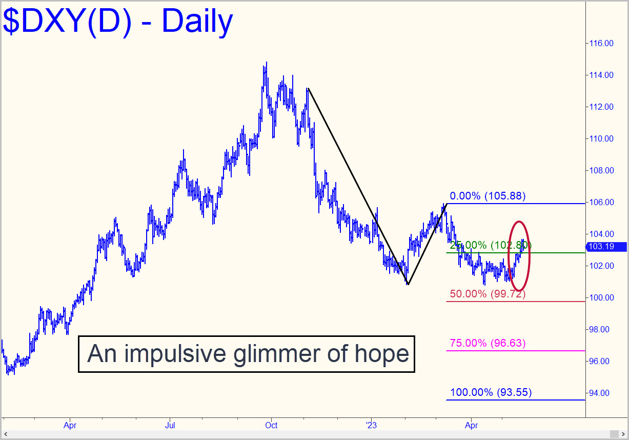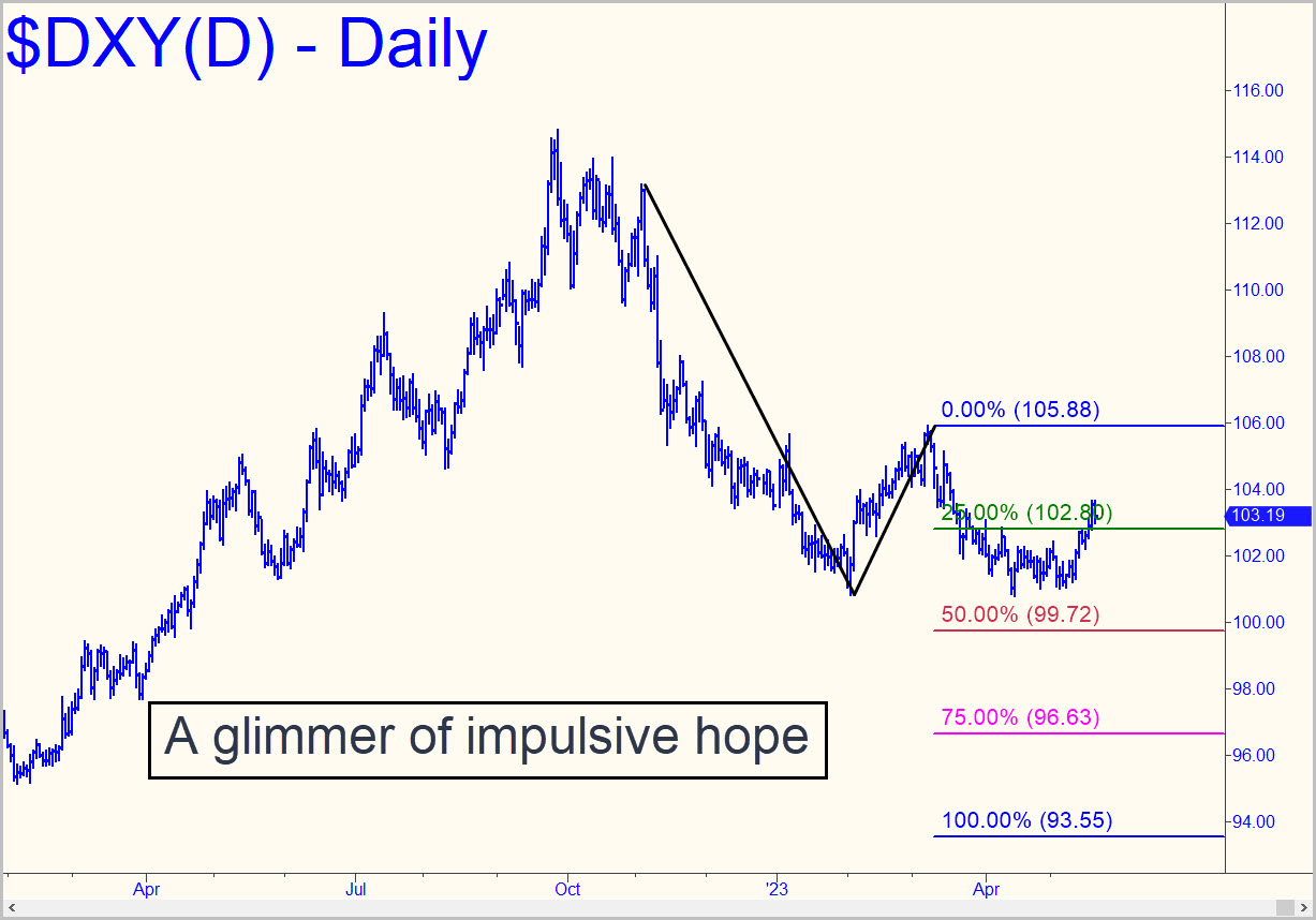 The rally of the last two weeks has gotten past four small ‘external’ peaks without taking a breather, so this could be the start of a sustained move. There hasn’t been one since earlier this year, but this one looks capable of reaching a minimum 105.85. That’s the ‘D’ target of a reverse pattern begun from 100.82 on February 2. As always, an easy move through a D Hidden Pivot would suggest bulls are not yet finished. Potential thereupon would be to 110.95 (daily chart, A=104.64 on August 10). Gold bulls should take note, since an extended rally in the dollar would put downward pressure on bullion.