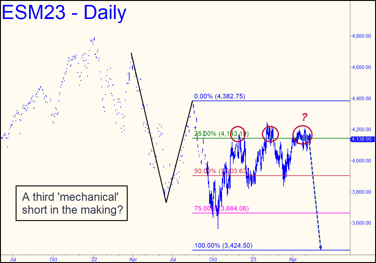 Let’s not waste too much time pondering what this sad sack of tailings is going to do next, since it hasn’t done much of anything for more than a month. That’s if you don’t count the meaningless spasms that occur whenever the latest drivel from the Fed hits the tape. The futures will always be tradeable, of course, but only with the kind of close attention that’s hard to muster with America in pre-holiday mode ahead of a three-day Memorial Day weekend that is just two weeks off. The work ethic, and all. I’ll mention in passing that the June contract has triggered two profitable ‘mechanical’ shorts since the bear rally began in October, each producing a $12,000 win per contract. Considering the amount of time traders spent screwing the pooch in the process, that worked out to around $3.57 per hour. If ES falls anew to the red line, however, racking up a third ‘mechanical’ winner, I’ll shift my focus to the 3424.50 downside target of the big pattern, shown here.