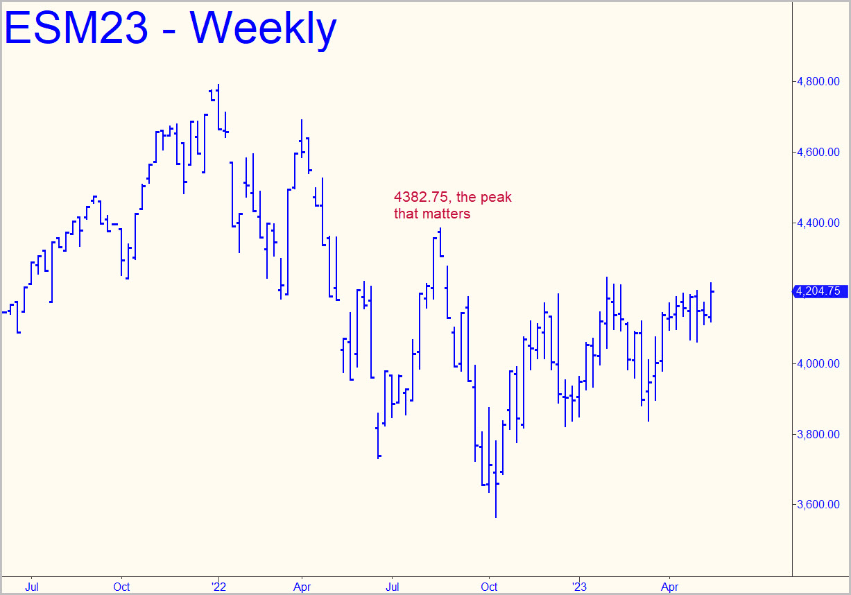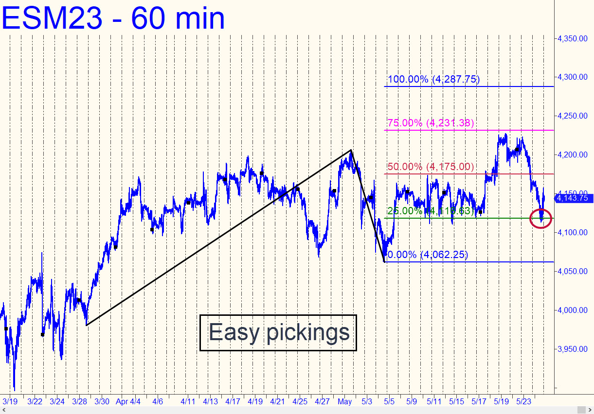 The futures ended the week a hair shy of the 4244.00 ‘internal peak’ recorded on February 3. Hold the applause if buyers should surpass it this week, however, since the 4382.75 peak from August 19 is the one that matters. A rally exceeding it would generate a bullish impulse leg of weekly-chart degree, putting in jeopardy the hopes and dreams of those who think an old-fashioned economic depression would be just the thing to asphyxiate the trivial concerns of wokeness, tame rampant paganism in America, rebuke a hopelessly corrupt political system and provide a reality check for an economic system that runs on debt and helium. Stay tuned to the Trading Room for white-hot trading tips while we’re waiting. _____ UPDATE (May 24, 8:54 p.m.): The ‘white-hot tip’ mentioned above popped up serendipitously during this morning’s tutorial session for advanced Pivoteers. It helped us fine-tune a textbook ‘mechanical’ buy after the futures finished mau-mauing bulls with what we will assume for now was a gratuitous dive. The rally target is the 4287.75 D pivot of this pattern, but we’ll sit back for now and let bulls prove their case. ______ UPDATE (May 25, 9:59 a.m.): The selloff that has caused last night’s short-squeeze to detumesce is not going anywhere, since the peak of the overnight rally exceeded yesterday’s high by two ticks. That makes it impulsive, so expect a rebound. Also, I have corrected the chart accompanying the previous update.