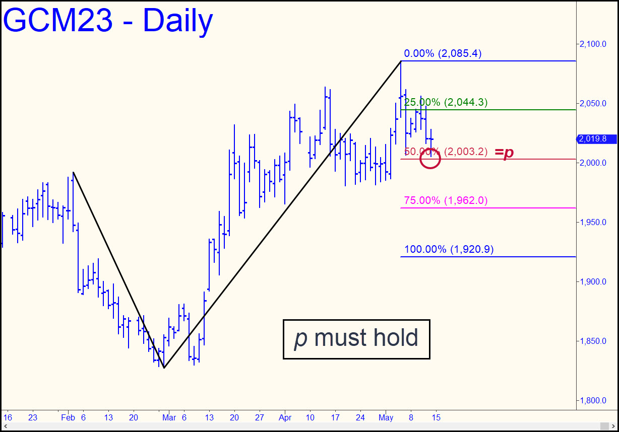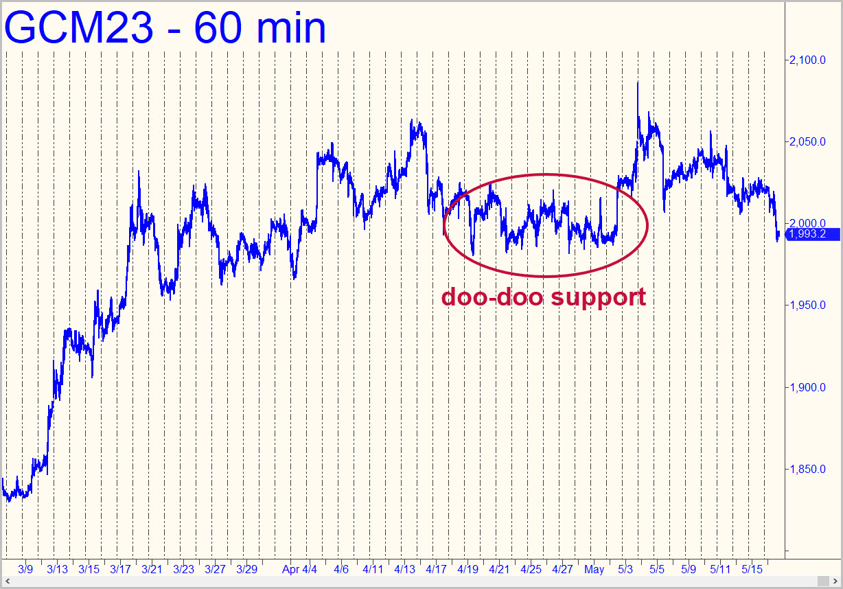 I’ve used a pattern similar to the one in Silver to show that both are in a precarious place, poised to fall at least 2% if their respective midpoint Hidden Pivot supports are decisively breached. So far, the pivots have held, but we’ll need to monitor price action closely this week. Like July Silver, June Gold is a spec buy at the moment, presumably using a reverse-pattern trigger on a chart of small degree. Doing so on the daily chart would risk a little more than $1000 per contract initially, far more than the $150 or so we should be willing to part with. _______ UPDATE (May 16, 5:22 p.m.): June Gold has fallen into the bog of weak consolidation that occurred in the last two weeks of April. The most bulls should hope for is that the futures rebound sharply after maliciously dipping beneath the bog’s low point, 1980.90 on April 19. Here’s the chart.