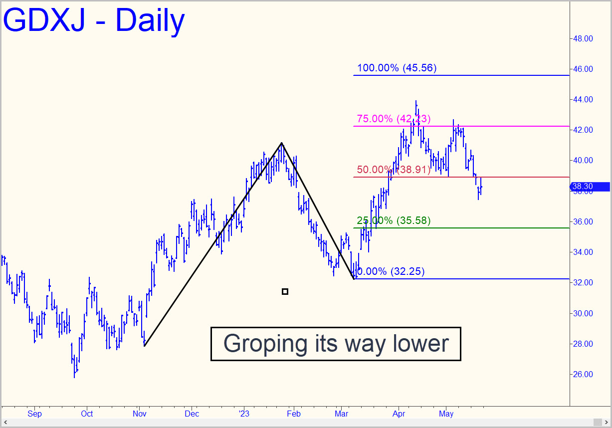 GDXJ looks like it will continue to grope its way lower to reflect softening quotes for bullion futures. If the bloodletting should reach the green line (x=35.58), however, it would trigger a ‘mechanical’ buy that we should not pass up. Corrections that traverse Hidden Levels from above p2 down to x often yield profitable ‘mechanical’ entries at the low, even if the anticipated bounce does not always achieve the D target. If bulls were going to find traction somewhere above x, it would have happened with last Thursday’s dip to D=37.73 of a corrective pattern begun on April 13 from 43.89. Alas, the support was breached, suggesting there is more downside to endure.