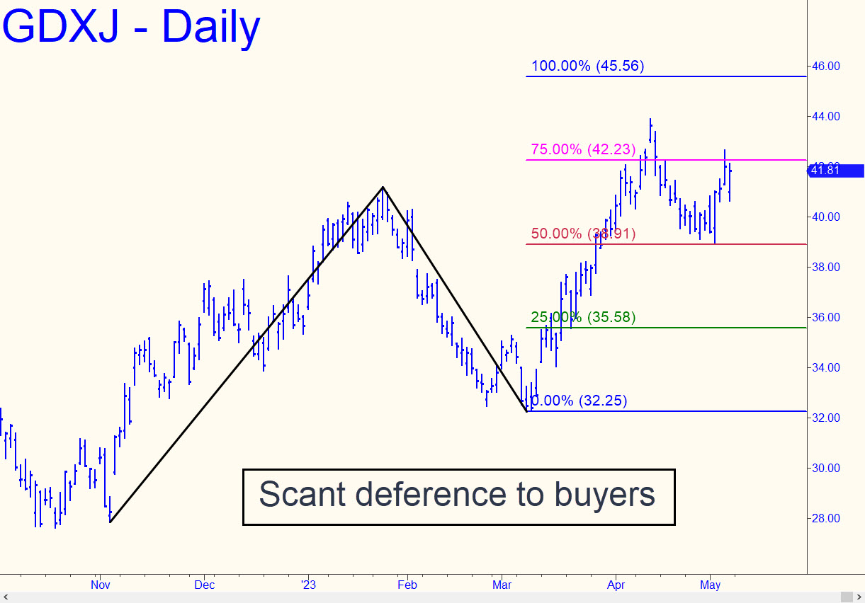 GDXJ triggered a ‘mechanical’ buy last week that got nowhere near the bids I’d suggested. Actually, the swoon didn’t even trip a ‘conventional’ buy, since the week’s low missed touching the red line by six cents (see chart inset). We may have to take what we can get if we’re going to be on board for the finishing stroke to the 45.56 Hidden Pivot target shown. I didn’t mention it here explicitly last week (although it was shown in the chart), but it has been our lodestone since mid-March and never in doubt.