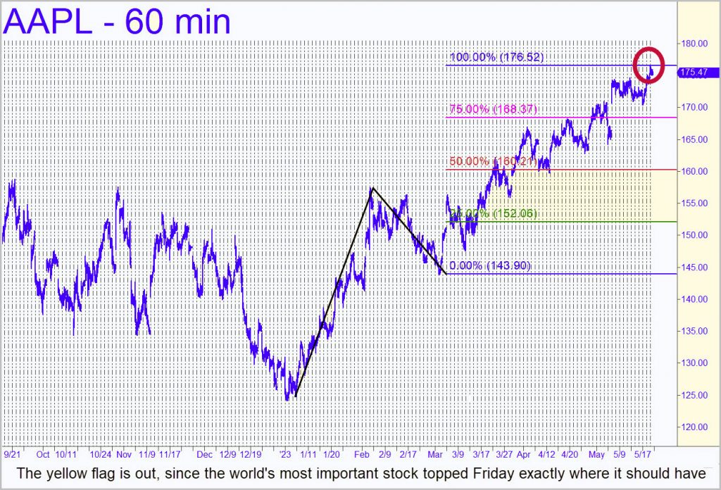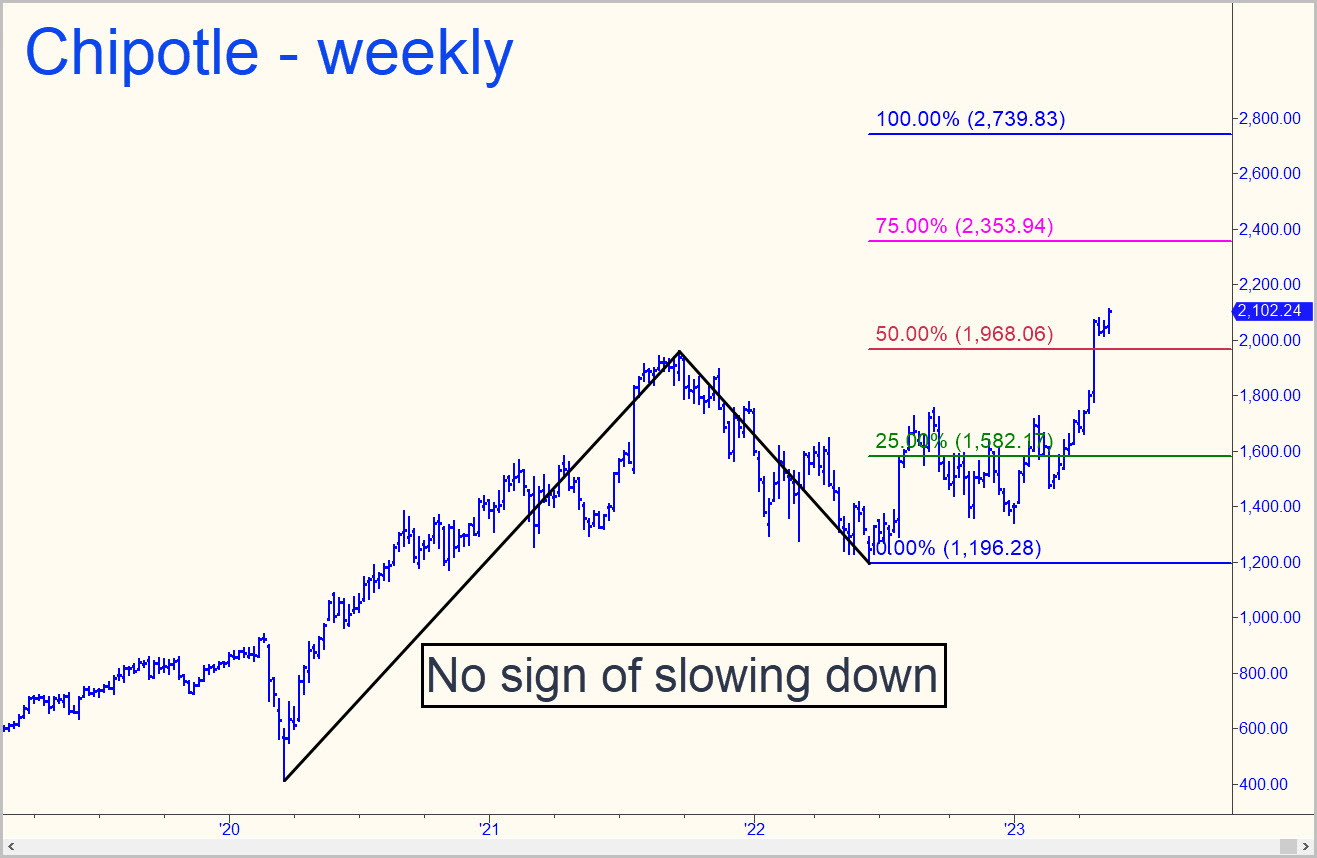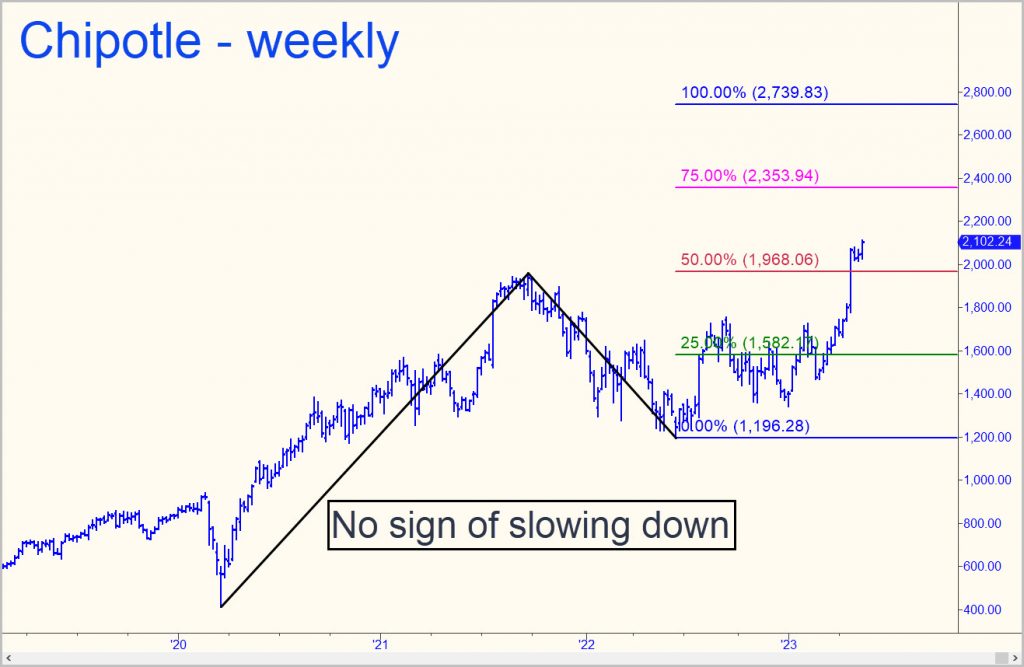 So how do I square the bullish certitude of my headline from two weeks ago with today’s downgrade to “maybe”? The reason is simple: AAPL hit a 176.39 high on Friday that fell just pennies shy of a rally target I began to drum-roll months ago. If the stock is about to resume the bear market begun from 182.94 as seems possible, then Chipotle is not going to hit $2739. This is an instinctual and very simple way of looking at how things might turn out, with two key stocks acting as checks against each other. I trust my charts and methods far more than I do narcotic ideas hatched by Wall Street’s quack team of analysts.