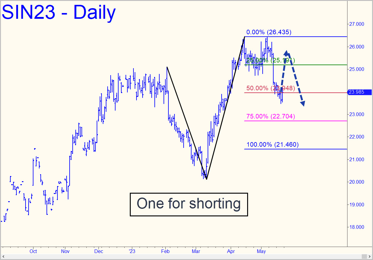 Although I’ve flagged a potential bottom-fishing trade in June Gold using ‘mechanical’ levels, July Silver would become a fetching ‘mechanical’ short if buyers push it up to the green line (x=25.19) this week. The implied entry risk of $6200 per contract would warrant a trick-shot entry using a small reverse pattern, but that shouldn’t present a problem for seasoned Pivoteers. Worst case over the next 2–3 weeks would be 21.460, although I doubt sellers have the moxie to accomplish something so dastardly.