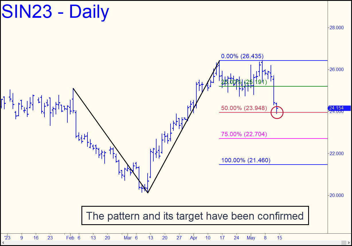 Last week’s plunge precisely to the red line, a midpoint Hidden Pivot support at 23.95, has validated the pattern and its 21.46 target. This is not necessarily as bearish as it sounds, since the futures will need to exceed p decisively, then close beneath it for at least two consecutive days, to imply they are bound for p2=22.704. For now , however, they would become a spec buy using an rABC trigger, since the midpoint pivot is always a logical place for a price reversal. Please nudge me in the chat room at the appropriate time if you are interested. ______ UPDATE (May 16, 6:13 p.m.): Sinking, soon to drop off the edge.