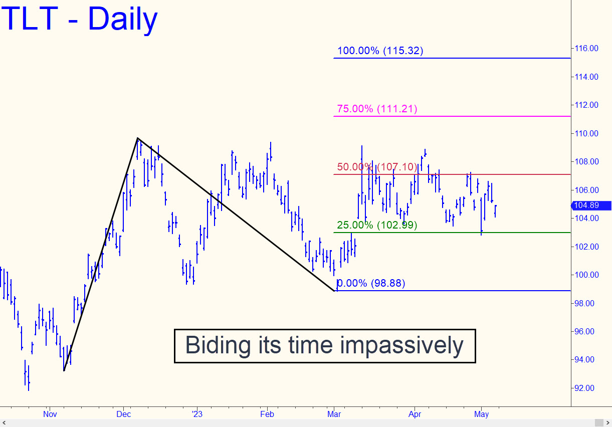 TLT has been biding its time since last December, trapped in a tedious range until it’s ready to break out for a shot at the 115.32 target shown. Last week’s dip to the green line triggered the first ‘mechanical’ buy signal we’ve seen on the daily chart this year. It would take a feint to the downside exceeding C=98.88 to stop out the trade. My hunch is that the next time buyers revisit the red line, a midpoint Hidden Pivot resistance, they will mean business.