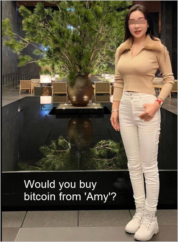Sometimes it seems like there are more scammers online than there are legitimate buyers and sellers. That has been said of Craig’s List, and not without reason. An important difference between someone you might meet on Craig’s List and a dating site is that the latter presumably would be much less likely to rob and murder you if you were to get together in-person. Regardless, if a sexy, young Asian woman approaches you online wanting to talk about bitcoin, you would do best to end the conversation then and there.