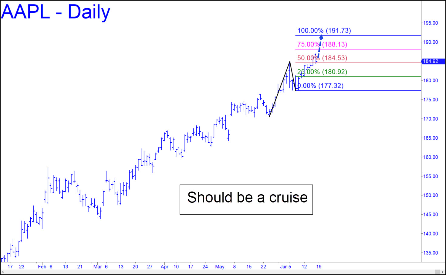 AAPL appears very likely to achieve the 191.73 target shown in the chart (inset), since the stock has spent two weeks above the Hidden Pivot midpoint (p=184.53) after impaling it on June 15 with an opening-bar gap. A swooning retracement to the green line (x=180.92) would trigger a ‘mechanical’ buy that you should not pass up if you trade the stock. Nudge me in the chat room when appropriate and I may be able to craft a risk-averse trigger for playing the bounce with call options.