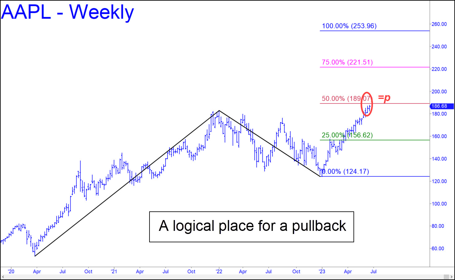 Once again, we look for AAPL to tell us what the stock market might do next. The chart shows last week’s high to have occurred just a hair from a key long-term resistance at 189.07, a Hidden Pivot midpoint associated with an ambitious bull-market target at 253.96. The actual high so far has been 187.56, fully $1.50 shy of the midpoint. That’s not quite close enough to warrant buying put options, but it would be no stretch to infer that an important top was made there last week. We’ll know soon, especially if the stock’s corrections on the lesser intraday charts begin to exceed their p or D supports. _______ UPDATE Jun 26, 11:57 p.m.): This morning’s head-fake sevened out $1 shy of the target, possibly because the pattern was obvious enough to attract the attention of riff-raff and mouth-breathers. It could be just organic weakness, though, so be prepared for the so-far modest retracement to pick up tempo. ______ UPDATE (June 27, 9:35 p.m.): With the stock trading just a hair beneath the 189.07 target noted above, subscribers bought July 180 puts expiring 7/14 for 0.50, pennies off the intraday low. Sit tight for now.