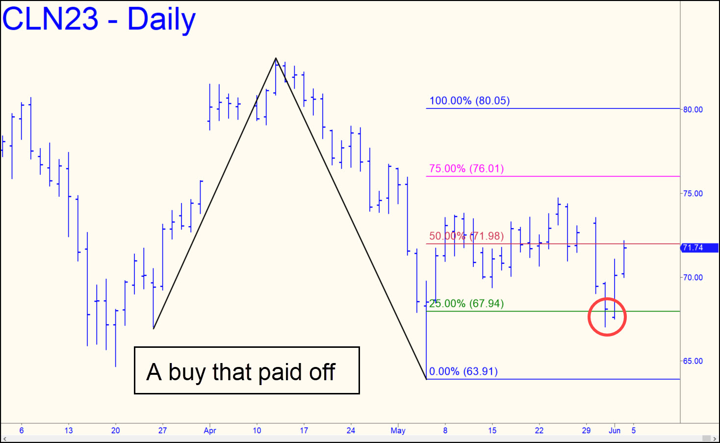 CLN23 – July Crude (Last:70.50)