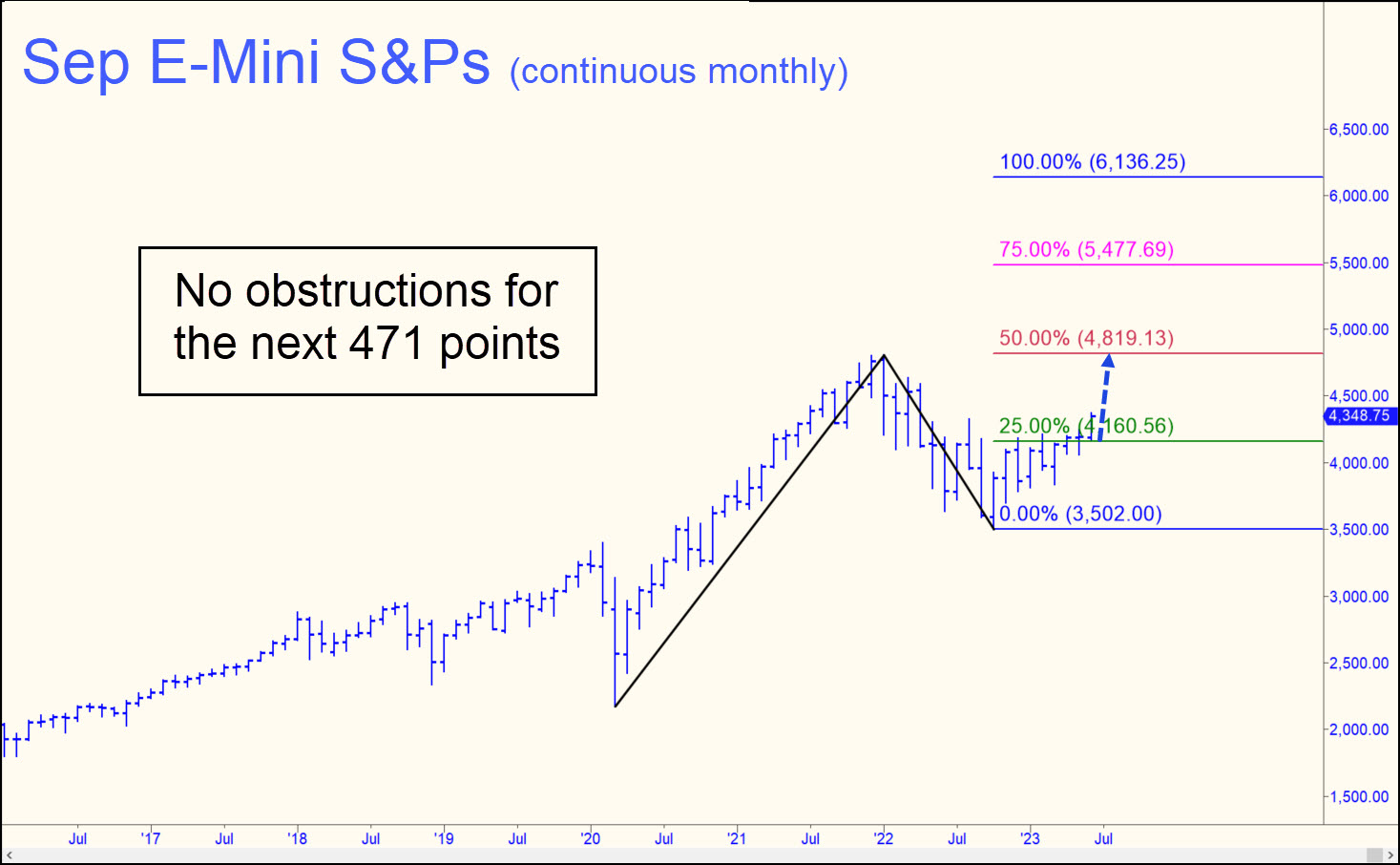 The stock market is in the grip of mass insanity, blithely ignoring warning signs of recession and the certain collapse of commercial real estate. How high could it go? To stretch your imagination, I’ve reproduced the weekly chart to show how 6136 is possible — 1788 points (41%) above the current 4348. This is not to suggest that a bear market collapse from last week’s high is not possible; it could indeed happen. But it seems unlikely, given that the 27% drop from Jan 2022’s 4808 peak couldn’t even generate an impulse leg. That would have required a further fall of 304 points beneath the 3502 low recorded in October. Under the circumstances, the rally since then seems likely to reach p=4819 at a minimum. Look for a temporary peak there that is tradeable, but don’t count on it to work precisely, since the chart is a composite of ABC coordinates from different contract months.