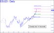 The September contract has signaled an all but certain rally to the 4576.25 target shown in the chart (see inset). The pattern is unorthodox but meets our all of our criteria for usability. Most immediately, it would enable a compelling ‘mechanical’ buy following a corrective swoon to p=4396.13 (for which a 4336.00 stop-loss would apply). A deeper retracement to the green line (x=4306.06) would be even more enticing as a place to bottom-fish. One or both of these numbers could conceivably be reached, since, as I’ve detailed elsewhere on this page, two bellwether stocks look ripe for punitive corrections.