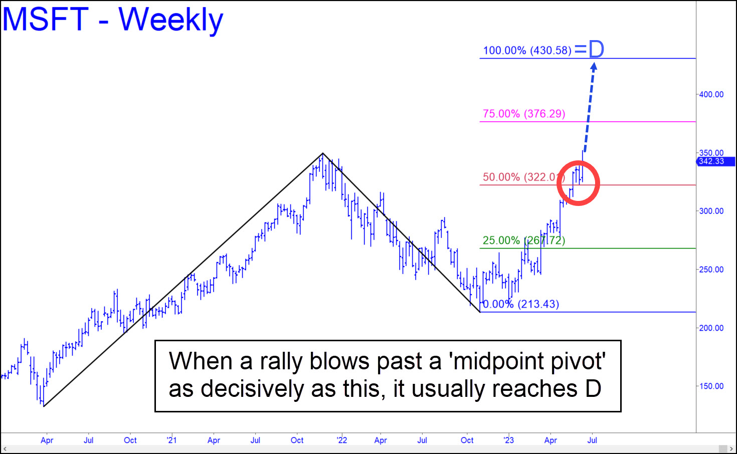 But only temporarily, I should warn you. That much is clear in the long-term Microsoft chart above. Although the imminent selloff could be brutal, I expect the broad averages to come roaring back to challenge the lofty highs recorded at the beginning of 2022. That’s why I would suggest taking partial profits early and often as stocks recede from the nearby rally targets as we should expect.