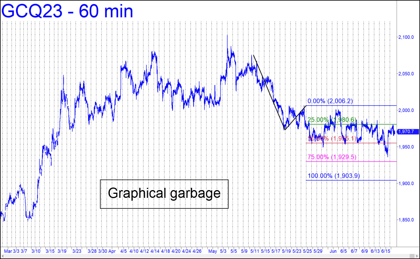 Yet another week of tedious slop produced no change in my bullish outlook for the intermediate- and long-term. For now, August Gold’s correction is targeted on 1903.90, a 3.5% drop from last week’s settlement price. Neither bears nor bulls have shown more than slight interest in bullion since early March, and both will likely be bored out of their minds before the bullish trend resumes in earnest. The first hint of this would come on a pop above 2006.20, the ‘C’ high of the pattern shown. Otherwise, expect the weak, downward dirge to continue. ______ UPDATE (Jun 16,): The presumably meaningless rally that ended the week triggered the fourth ‘mechanical’ short since May 30. The first three produced a theoretical profit of $10,000 apiece on four contracts. Here’s a fresh chart that shows gold’s pooch-screwing price action. _______ UPDATE (June 20, 1:58 p.m.): With gold in its wonted gold-is-garbage mode, the 1903.90 downside target is looking increasingly likely to be reached — and precisely, given the umpteen bounces the futures have taken from p=1956.10. An arguably even more appealing pattern projecting to 1892.10 will be in play if 1903.90 is exceeded by more than $1.00 or so. I say ‘more appealing’ because of the pert little alternative one-off ‘A’ at 2087 recorded on May 4.