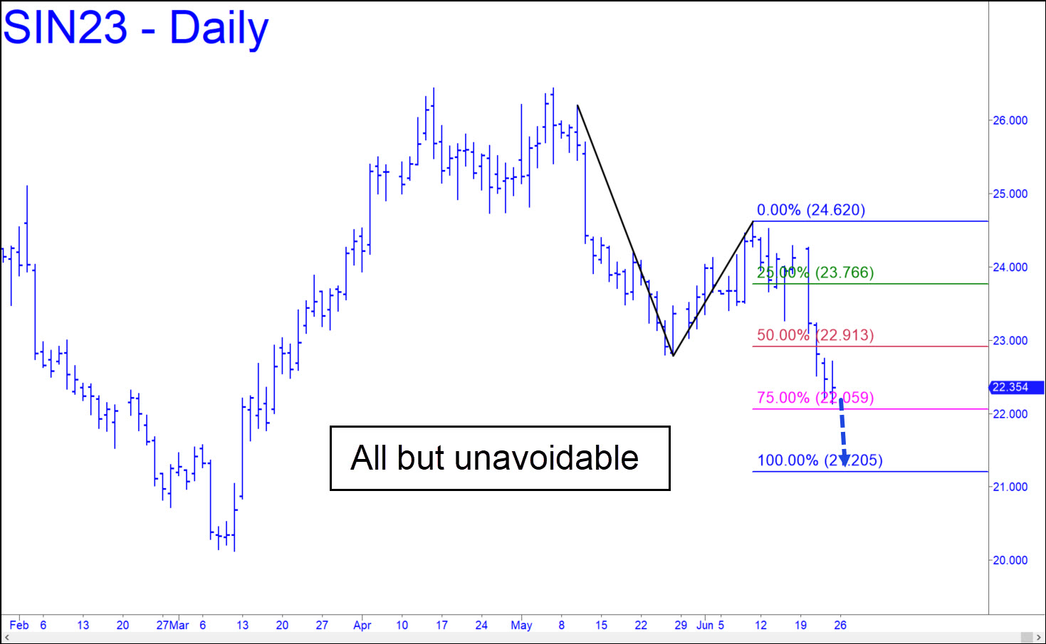 July Silver caught a bounce from the 22.06 secondary Hidden Pivot last week, but that won’t save it from a further fall to the 21.205 target shown in the chart (inset). That much is clear from Wednesday’s crushing breach of p=22.91. The pattern looks too obvious to deliver a precise bounce, but a tradeable turn from very near the target seems unavoidable. So far, the ‘natural’ trigger interval on a reverse-pattern entry would be 25 cents, but we’ll look for alternative ways to get aboard (i.e., ‘camouflage’), since the implied entry risk on four contracts would be around $5,000.