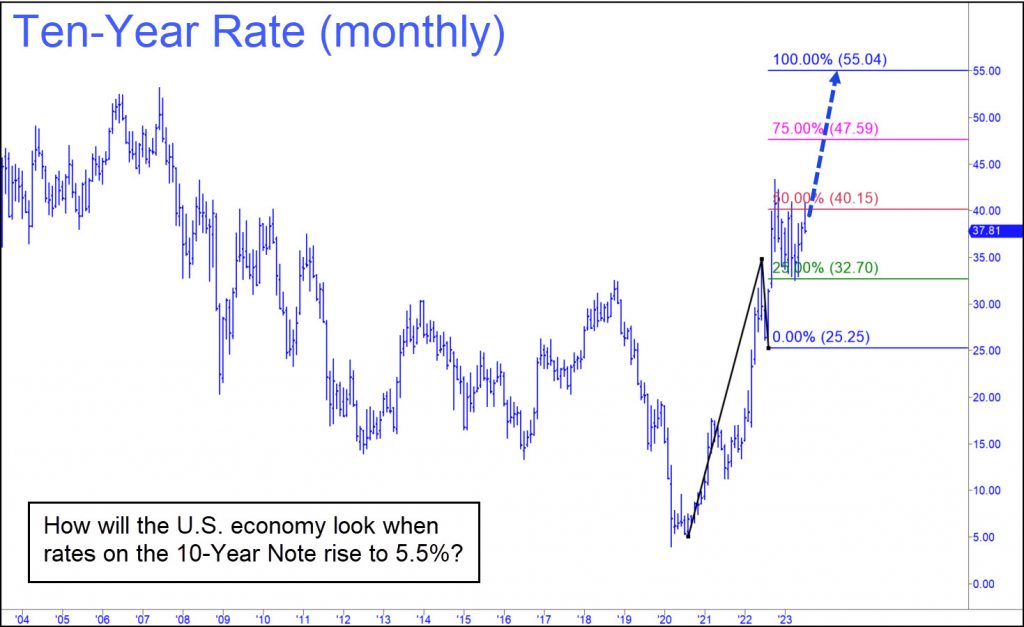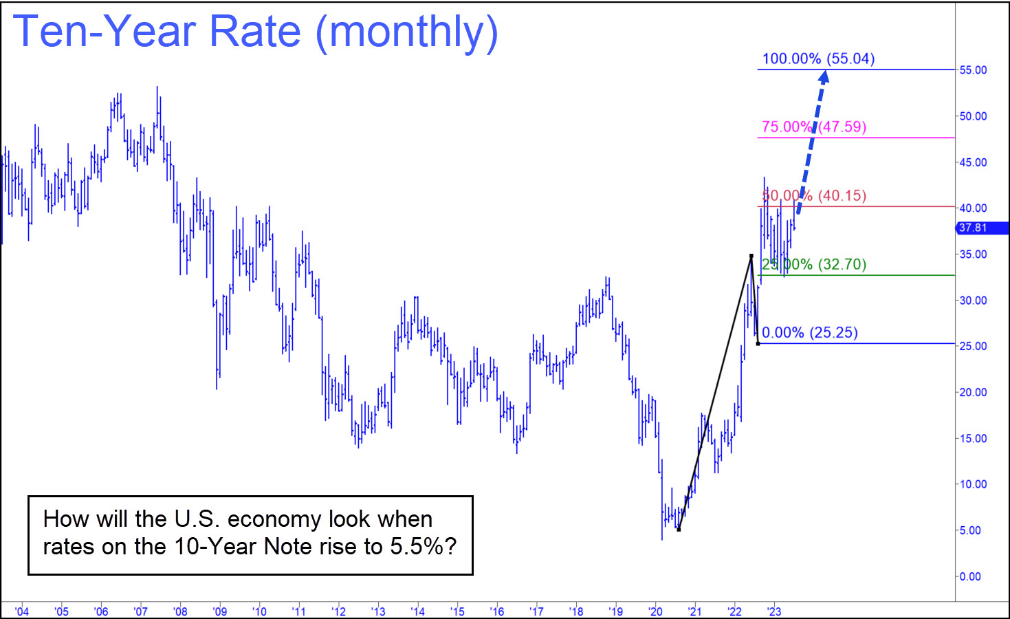 Jim Grant, the financial word’s adult in the room, says the bear market in Treasury bonds could last for decades. Do the long-term charts bear him out? The one reproduced above suggests that it’s at least possible that we are in the early stages of such a move. Most immediately, the chart projects a further rise in 10-year rates to at least 5.5% over the next 2-3 years, a 45% leap from the current 3.9%. If this were to occur, it means the deflationary bust I have long predicted will have to wait. That’s because rates that high could not possibly co-exist for long with falling asset values.