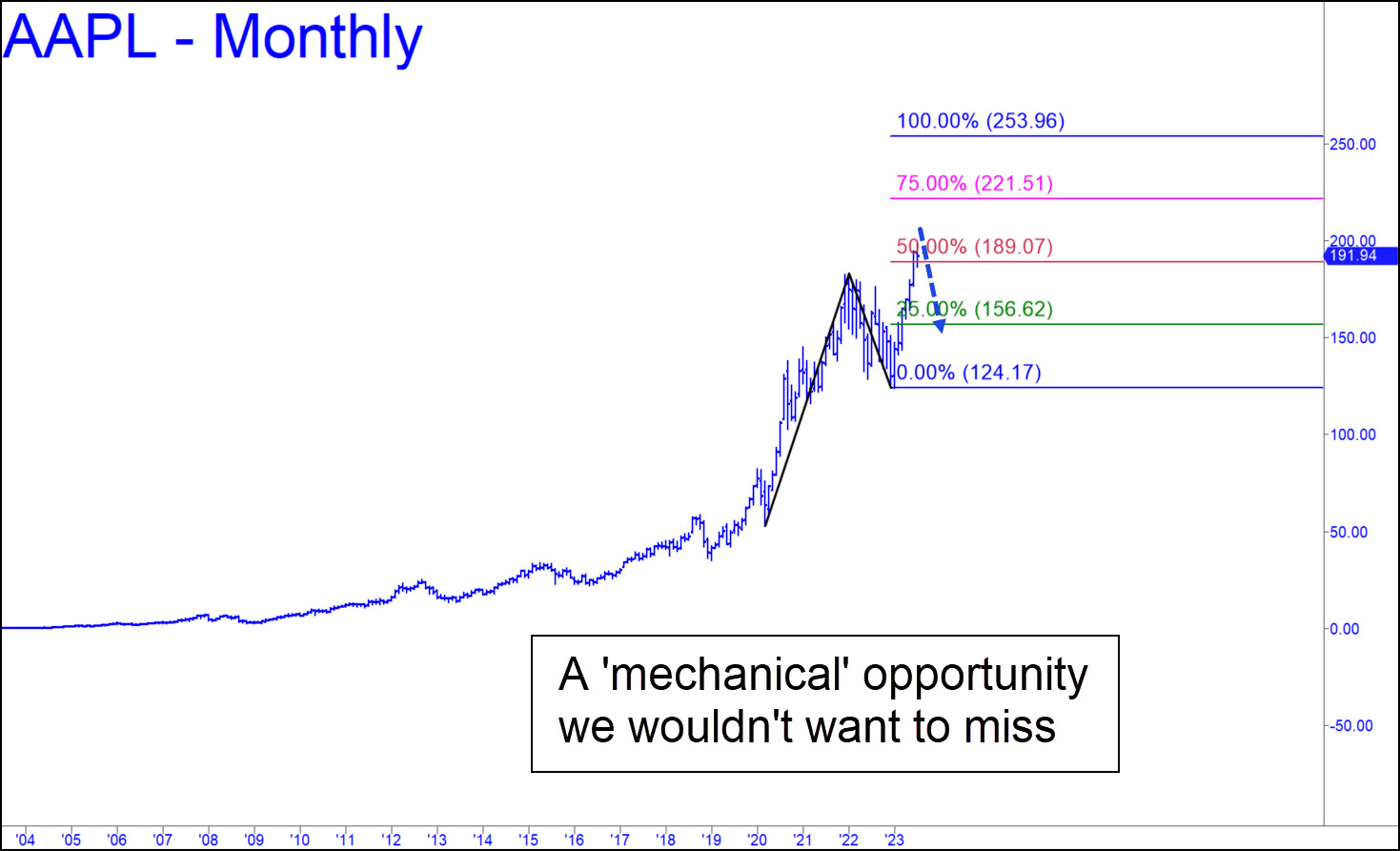 The steep rally begun in January has barely paused for breath, so relentless that it could properly be described as a manifestation of mass psychosis. And here’s the thing: This the largest-cap stock in the world, with a $3 trillion valuation, so every ratcheting, short-squeeze rally adds tens of billions in ‘wealth’ to the world’s macro ledger. It can’t end well, since, in a recession, Apple’s pricey iPhone will be near the top of the list of things that consumers stop buying. In the meantime, we can only watch in amazement as the stock continues to ascend toward the 253.96 target pictured in this chart. Please note that with just a little more upside above the 198.23 high, the stock would become a screaming ‘mechanical’ buy on a pullback to x=156.52. AAPL is egregiously overdue for a very nasty selloff, but we’ll need to see corrective ‘d’ targets on the lesser charts start to be exceeded routinely before we infer the retracement is under way. _______ UPDATE (Jul 27, 7:25 p.m.): The yellow flag is out, since today’s by-now-obligatory gap-up opening failed to surpass last week’s high. The subsequent dive, trapping bulls and bear alike, created an impulse leg, but let’s see if bears can improve on it into week’s end, turning it into the start of something big.
