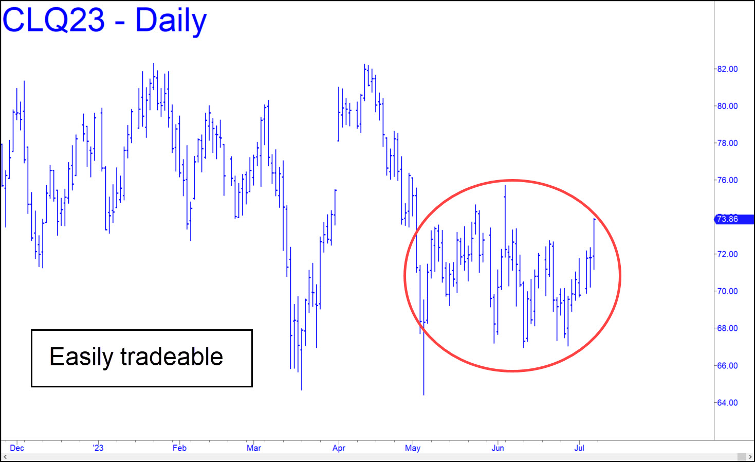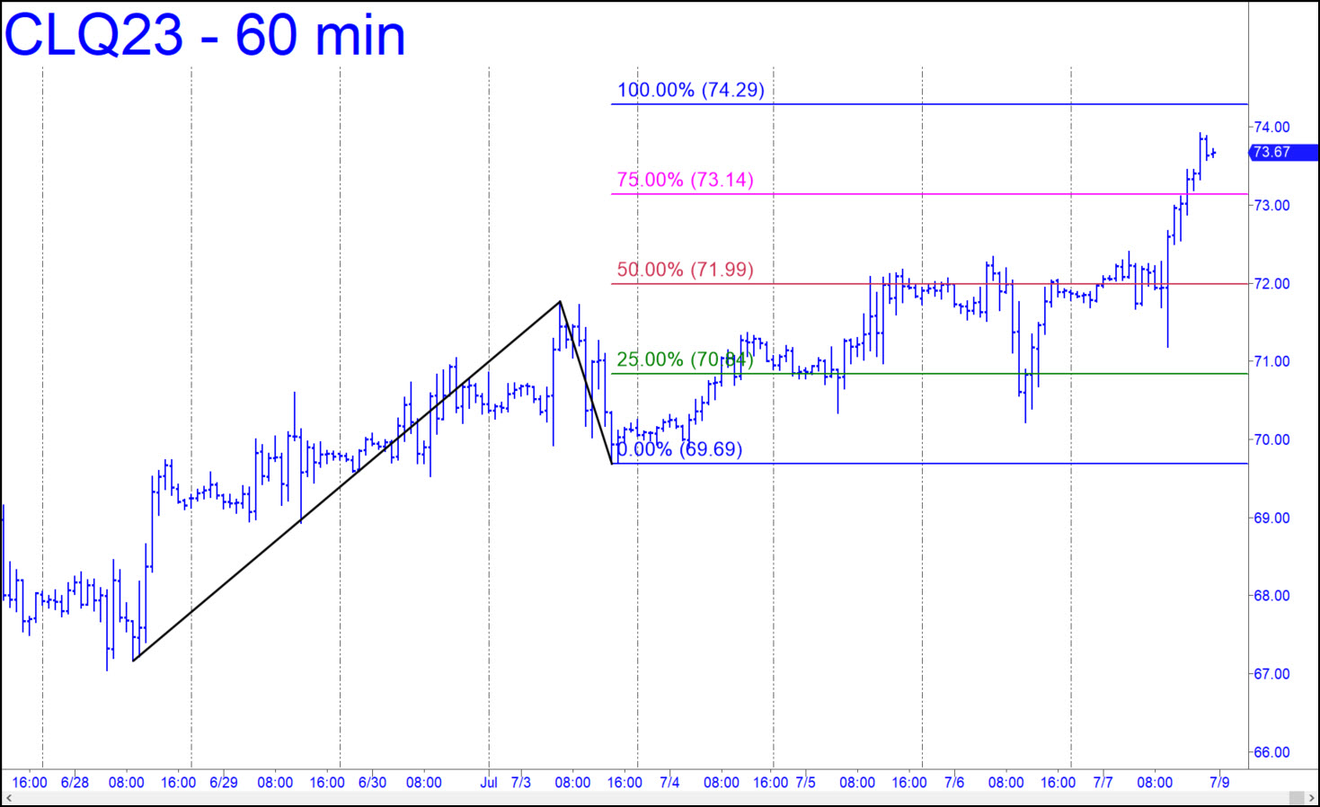 August Crude’s histrionics have been easily tradeable, most recently via a nasty dive on Thursday from within three cents of a rally target advertised here when fresh touts went out to you last Sunday evening. The futures rampaged to a strong close on Friday that could get legs, but more immediately they will face resistance from the 74.29 Hidden Pivot resistance shown in this chart. Pivoteers familiar with reverse-patternĀ (rABC) trades can try it with a trigger interval no greater than 16 cents, but be alert to a possible short squeeze that blows the target to smithereens when trading resumes this evening.