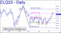 The unorthodox reverse-pattern shown has worked so well, generating three profitable ‘mechanical’ buy signals at the green line, that we should confidently expect it to produce yet another winner when it trips a ‘mechanical’ short at D=79.68. The trade will require some adroit calculations in real time, however, since the most efficient trigger interval that I can come up with at the moment is 78 cents, implying entry risk of at least $780 per contract.
