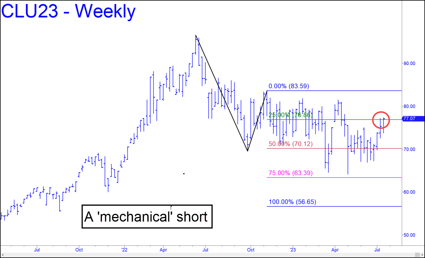 Crude’s tiresome game of tiddlywinks tripped a ‘mechanical’ short two weeks ago when the September contract rallied to the green line (x=76.86). A portion of any multi-contract position would have been covered ahead of last week’s rally, although there was no indication of any interest in the trade in the chat room. Trade possibilities aside, the implicit assumption of my analysis is that this is yet another rally that lacks the gumption to push above the bearish pattern’s ‘C’ high at 83.59.