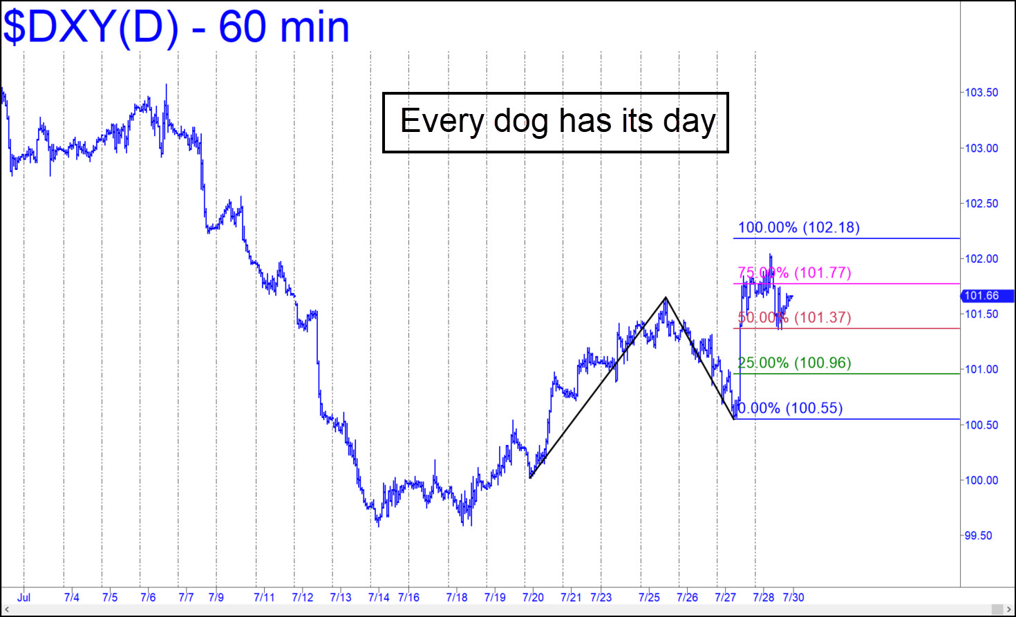 Every dog has its day, so perhaps that explains why bowser has been forging higher since mid-July. The pattern shown projects to at least 102.18, but we’ll need to see how bulls handle the resistance before we are able to judge whether the rally will get legs. Judging from the way a hypothetical ‘mechanical’ buy at the red line (p=101.37) took off without probing any lower, DXY appears to be a very strong bet to blow past D=102.18. Speculative call buying is warranted, although I am unable to provide precise guidance ahead of Sunday evening’s opening. ______ UPDATE (Aug 2, 9:19 p.m.): A fresh impulse leg on the hourly chart promises to keep this rally going, presumably to a test of highs near 103.50 recorded in late June and early July.