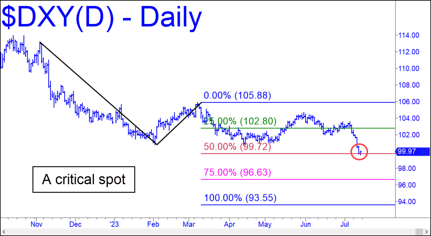 The dollar was plummeting when the week ended, so I’ve changed the view to graphically display a 99.72 target we can use as minimum downside objective for the near term. It is tied to a ‘D’ target at 93.55 given here previously that would equate to an 18.5% drop in the Dollar Index since it topped at 114.78 last September. This would leave it just a tad shy of ‘official’ bear-market territory, but considering the size of the market for dollars, it has suffered damage commensurate with a Category 5 hurricane. The dollar will have its day eventually when debt deflation rears up, but until then, debtors should be relieved that a strong dollar is not compounding their problems from higher interest rates. _______ UPDATE (Jul 15): Last week’s hellish plunge brought the Dollar Index down to the 99.72 target almost precisely. This is the midpoint Hidden Pivot support of a pattern projecting to as low as the 93.55 target noted above, and it must hold like a rock if the dollar is going to avoid diving anew in the months ahead. _______ UPDATE (Jul 18, 6:29 p.m.): The support is holding, but only barely. It is not a bullish sign that sellers have been pounding on it for a week.