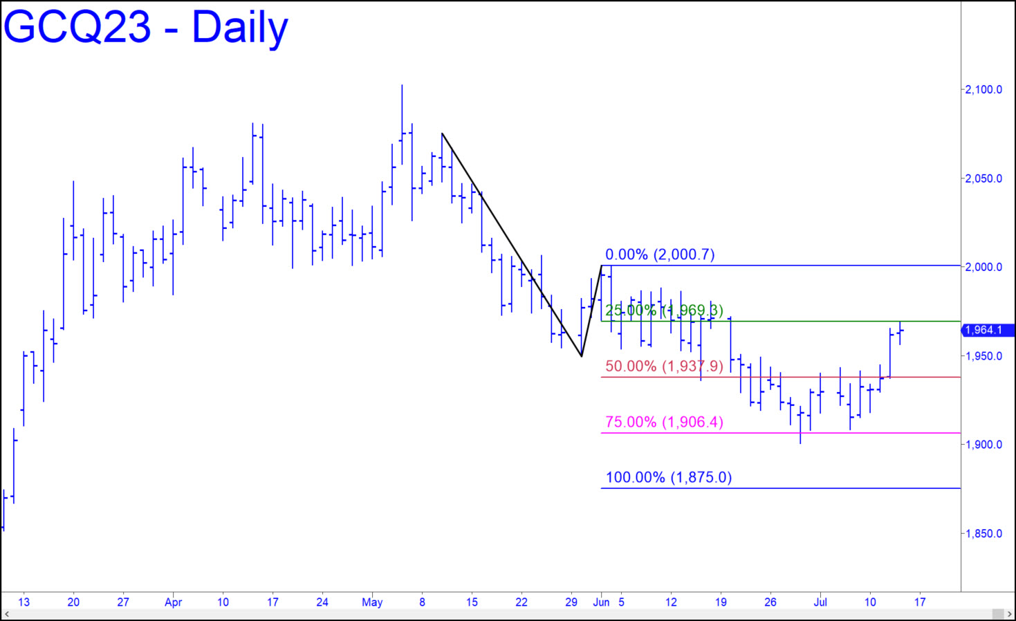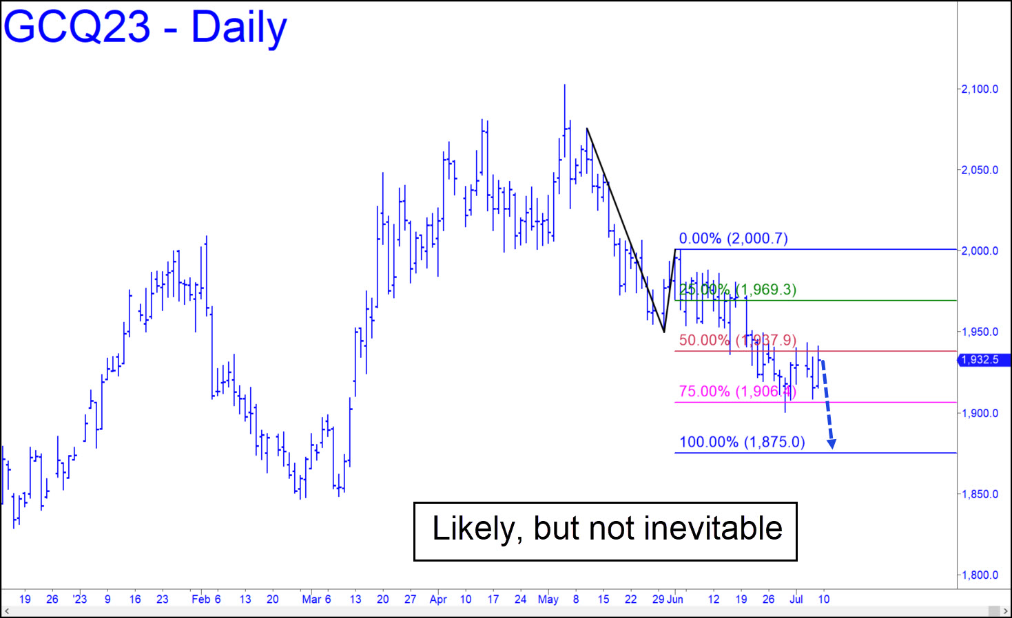 August Gold has struggled for loft after bouncing from just beneath a Hidden Pivot support at 1903.90 that I’d flagged on June 29. Bullion tends to taunt us with weakness before rallying sharply (albeit fleetingly) to nowhere in particular. In this case, however, it looks like it wants to go lower in order to get better footing for a sustained uptrend. We can use the 1875.00 downside target shown for now, but we’ll switch to a more bullish outlook for trading purposes if buyers can push above an external peak at 1949.00 recorded two weeks ago. _______ UPDATE (Jul 13, 10:15 a.m.): The futures tripped a ‘mechanical’ short when they came within a hair of x=1969.30 at 8:35. The subsequent $12 dive could have been shorted with a reverse-pattern trigger, but I am suggesting only that you paper-trade this one. If it is stopped out with a rally above the pattern’s ‘C’ high, that would be the most bullish event we’ve seen in a while. Even then, we shouldn’t trust the rally until it has created a series of impulse legs on the lesser charts.