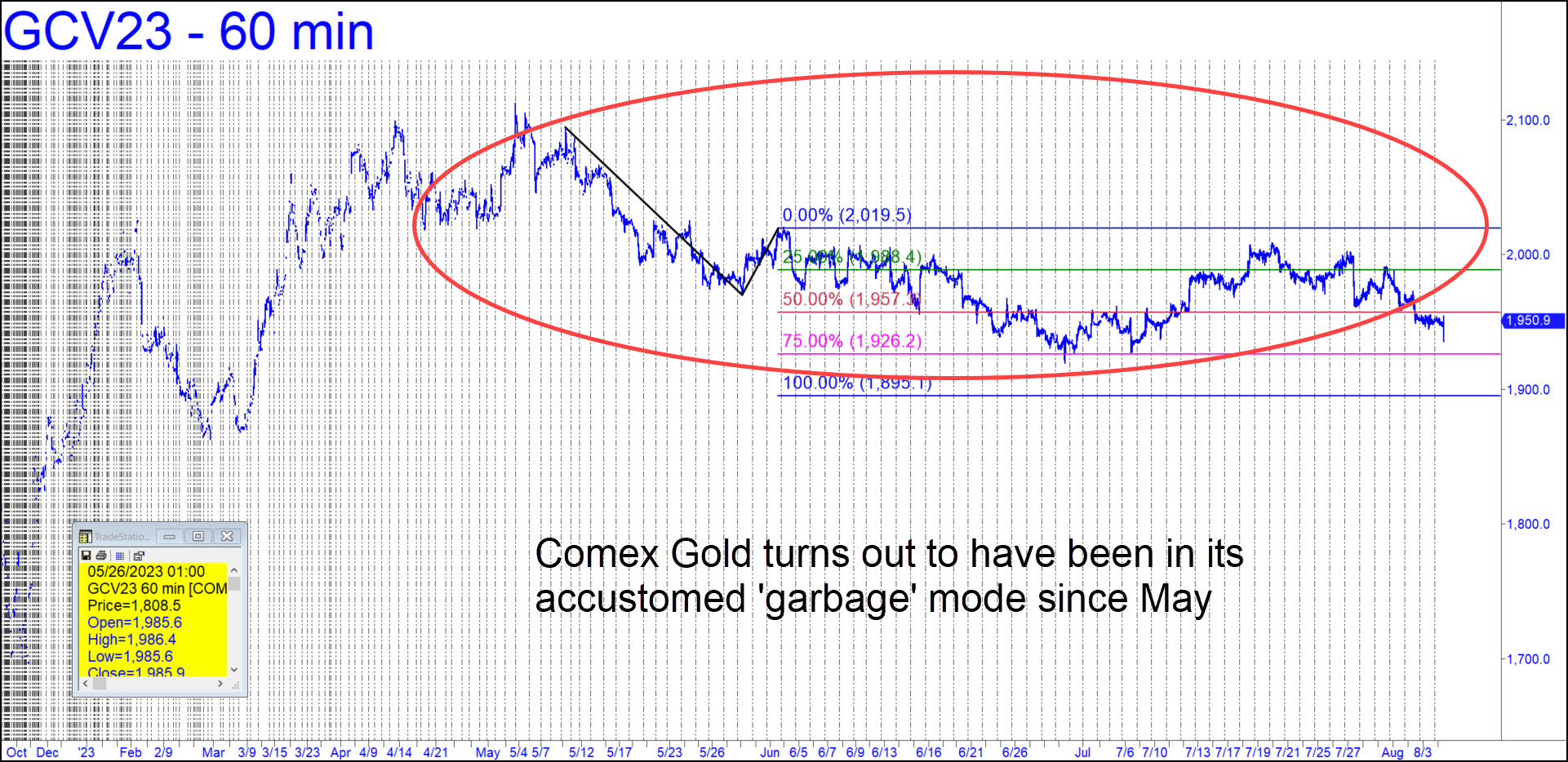 As usual, Gold is taking its sweet old time going anywhere, never mind to the 2027 midpoint Hidden Pivot of the pattern shown. We’ll need to see how buyers handle this resistance before we can judge the likelihood of a rally to the 2154.20 target. The August contract is on a theoretical ‘buy’ signal at the moment, but the only way to use it with risk tightly controlled would be to set up a ‘camo’ trigger on an intraday chart. Stay tuned to the chat room if you care, since I may be able to signal a timely opportunity tied to this vehicle’s wonted morning reversals. _______ UPDATE (Aug 4, 8:43 a.m.): Gold has slipped back into its accustomed ‘garbage mode’, in a bull market more reminiscent of The Flying Dutchman in search of land than its 1970s heyday. Here’s a chart that shows an 1895.10 downside target for the October contract.