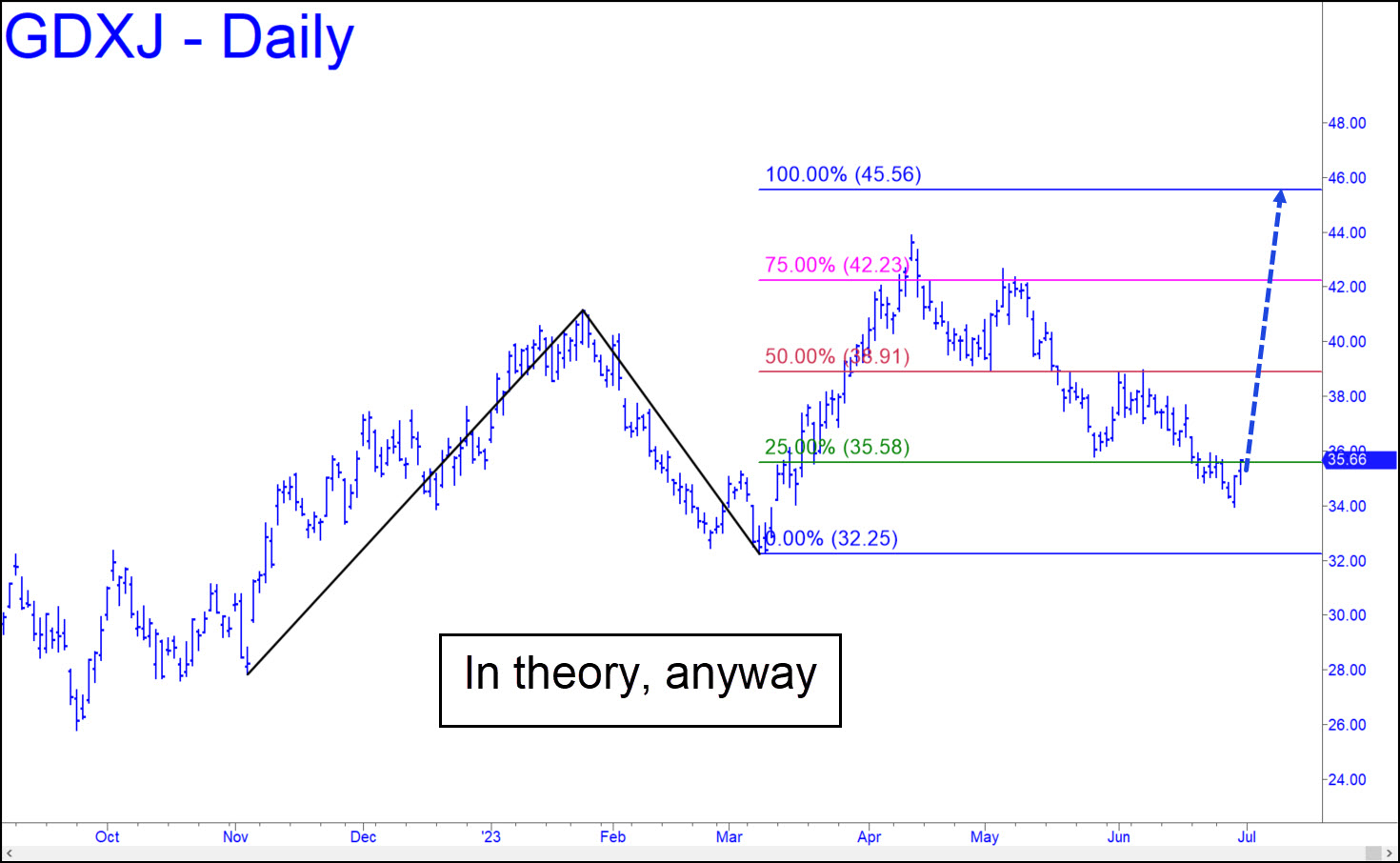If pigs could fly, this sorry old sow would still be trailing its hind quarters in the mud. What a disappointment it has been! Even so, and much as I’d enjoy trash-talking a favorite gold-miner proxy, it is actually on a ‘mechanical’ buy signal that triggered when it touched the green line (x= 35.58) on June 21. Ordinarily, that would give rise to expectations of a rally to D=45.56. In this case, however, assuming GDXJ can come out of its death spiral from a low exceeding C=32.25, I would lower my expectations to p=38.91 — a mere one-level ride — for trading purposes. Set an alert at 37.68 for now, since that is where a rally would generate an impulse leg on the daily chart, There are ways to get long before then, but you’ll need to nudge me in the chat room if you want to discuss them.