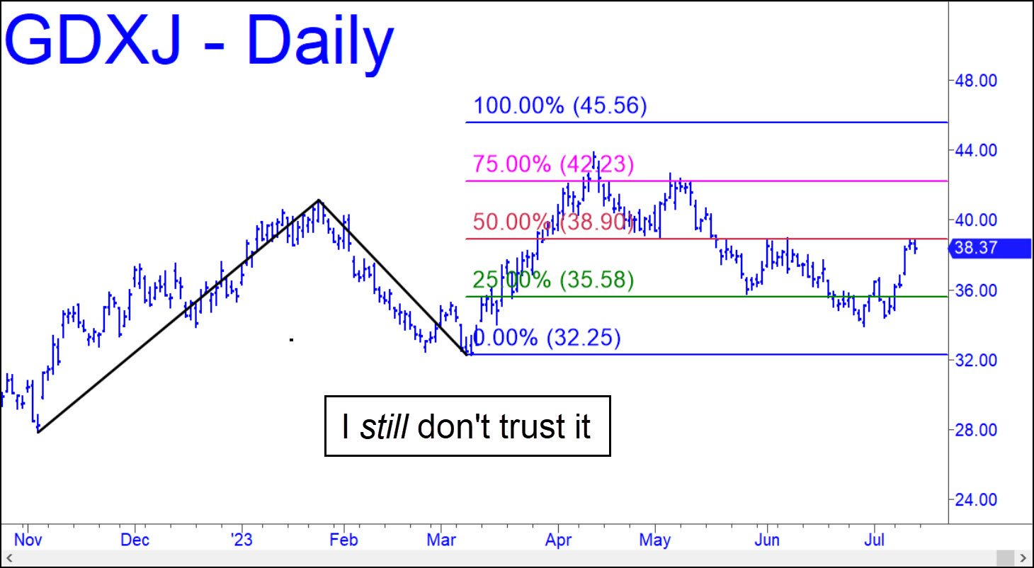 GDXJ has done much to earn our distrust since collapsing from a high in April that fell less than $2 shy of a 45.56 target that had looked like a lock-up. It is currently on a ‘mechanical’ buy signal triggered on June 21, when the downtrend plowed through the green line (x=35.59). I broke with my discipline, passing up the trade, but I won’t make that mistake again if the little s.o.b. gives us a low-risk entry opportunity. I still doubt the 45.56 target will be reached any time soon, but that shouldn’t scare us away.