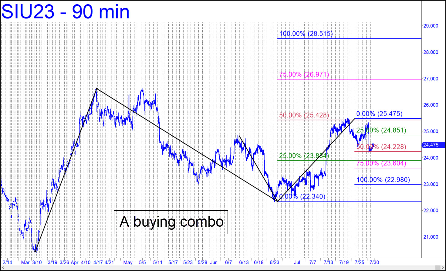 I rarely display a chart with two patterns, but in this case, both have been working well enough to provide a handhold for trades in either direction. The 24.22 midpoint Hidden Pivot of the smaller, downtrending pattern caught a tradeable low on Friday almost precisely and would signal a ‘mechanical’ short if the futures were to touch x=24.85 (stop 25.48), as the new week begins. There’s $12,600 0f theoretical entry risk on four contracts, so this one is intended only for subscribers who have mastered ‘camo’ set-ups. _______ UPDATE (Aug 3, 7:05 a.m.): Only one subscriber mentioned having done the trade, so I did not establish a tracking position. The short from the green line is still ‘live’, however, and has produced a profit so far of $3150 for each contract covered at the red line. Typically, I advise covering half of any position there, or of implementing an ‘impulsive’ stop-loss if just a single contract is held.
