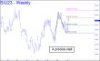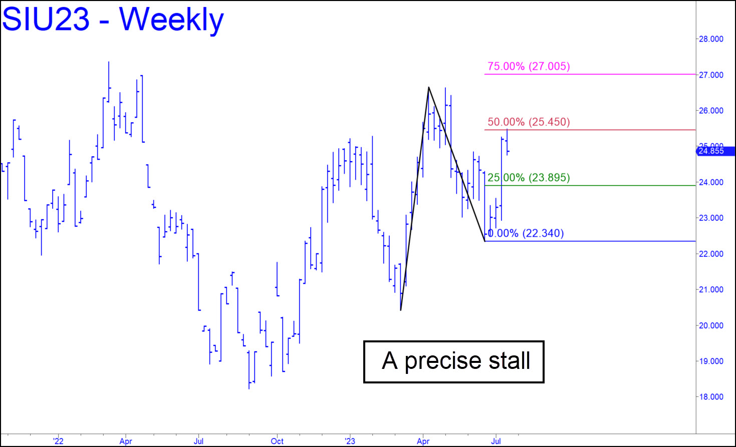 A short from the red line (p=25.45) could have been worth as much as $14,000 by week’s end on four contracts, although no one mentioned having done the trade, so I didn’t track it. Now, draw a reverse pattern on the weekly chart using A=24.83 on 6/9, and you’ll see why p=24.228 can be used as a minimum downside projection for the near term (and 22.98 as a worst case). It can also be used to bottom-fish with a ‘reverse-pattern’ trigger. If silver surprises and closes above last week’s 24.47 high, that would put the 28.56 target in play. _____ UPDATE (Jul 27, 7:20 p.m.): Silver did in fact plunge today to within an inch of the 24.22 midpoint Hidden Pivot where I’d suggested bottom-fishing (see above), but I won’t provide tracking guidance unless I hear from at least two subscribers who traded on my guidance.