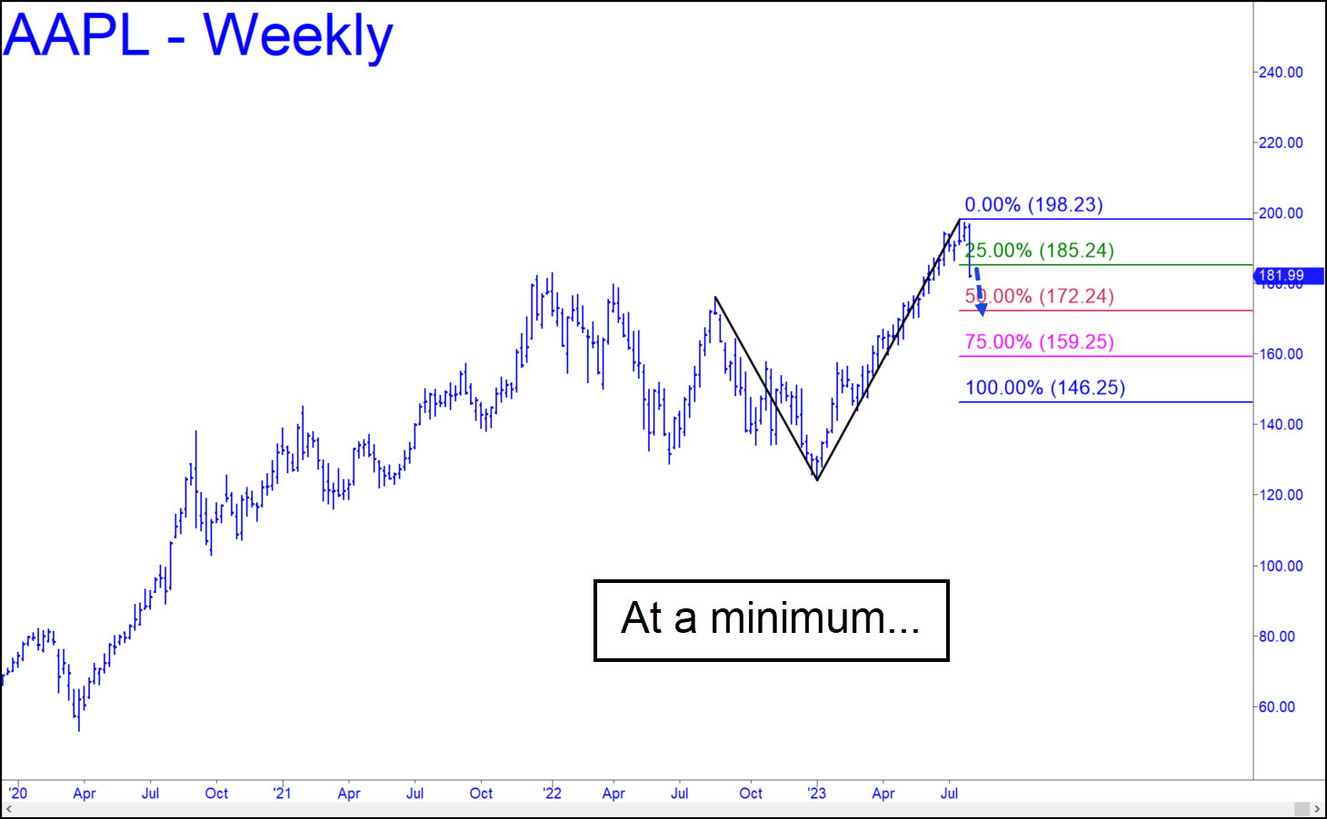 It’s refreshing to see AAPL get the crap kicked out of it for a rare change. And there’s more to come! But don’t think that the chimps that this buy-and-hold no-brainer has made look like geniuses are not salivating over the prospect of accumulating more shares at ‘bargain’ prices, and of running the stock back up again without expending much effort or capital. Gap openings induced by short-covering will make that possible, just as they have since early in 2020. We can attempt to bottom-fish, but not before the correction comes down to at least p=172.24, the Hidden Pivot midpoint support of the reverse pattern shown in the chart. This implies the broad averages have further to fall as well. If the stock ultimately plummet to d=146.25, that would represent a 26% correction off the all-time high — a mini-bear market within a longer-term bull that projects as high as 253.96. _______ UPDATE (Aug 7, 9:54 p.m.): Are DaBoyz awesome, or what?? They don’t call them the Masters of the Universe for nothing. It seems They have finally figured out how to harness AAPL’s lunatic energy on the way up while cutting it loose when it falls. If you’d told me that a $3 trillion stock was about to plummet by 10% in just a few days as the broad averages sad idly by, twiddling their so-to-speak thumbs, I’d have said “No way!” And yet…
